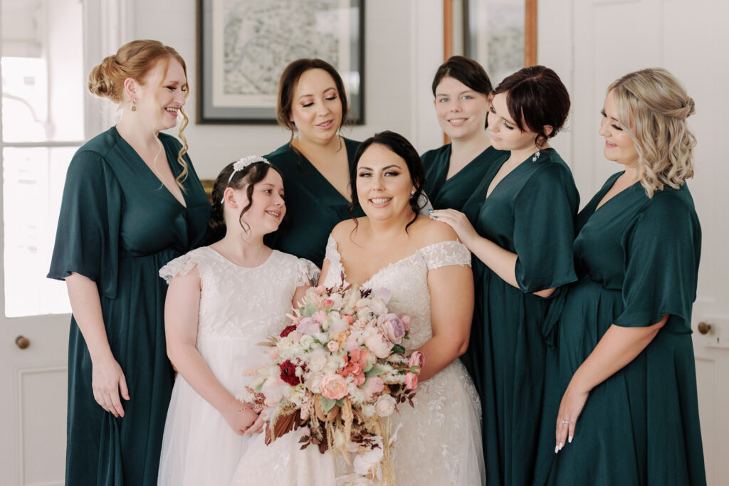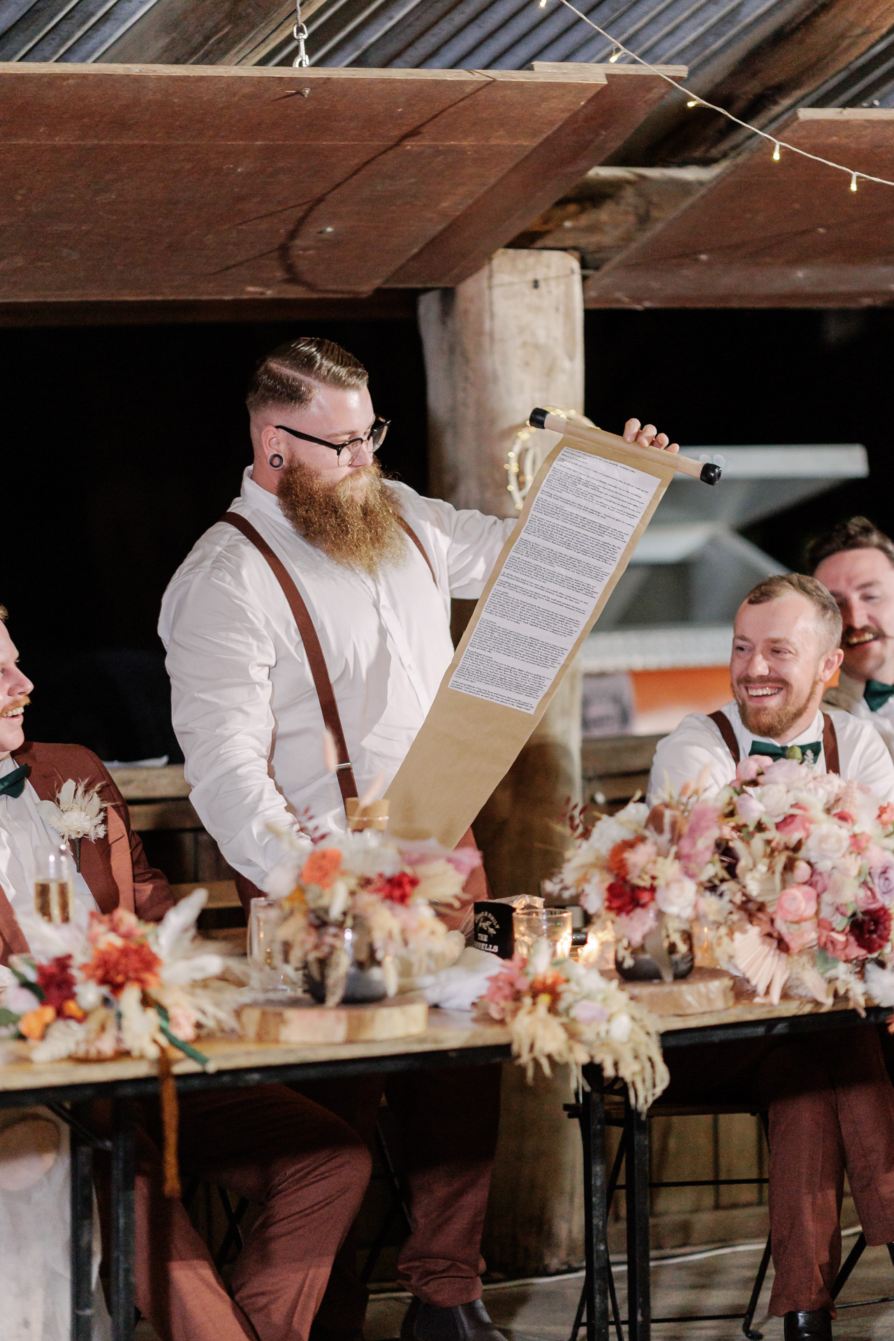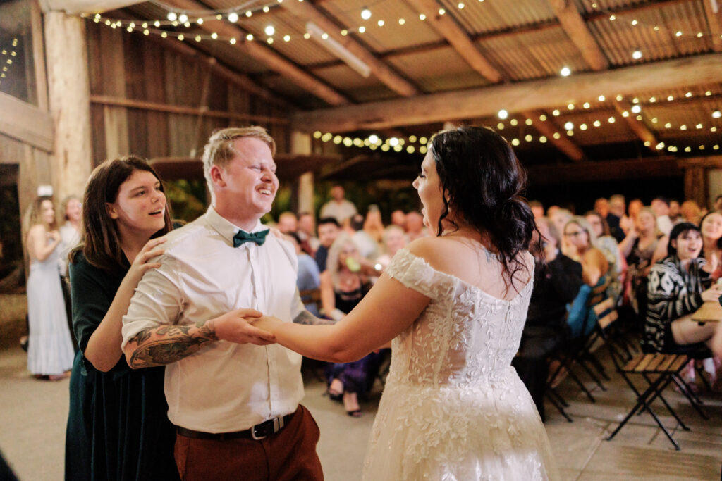 The barn was a quick drive away so by the time we arrived for the reception the guests were enjoying themselves chatting and having a few drinks outside. Once everyone was seated in the barn the bridal party were announced followed by the newlyweds. Everyone settled in for dinner and the formalities rolled on. Speeches were a highlight with Emily’s daughters stealing the show, all the guests loved them. Next up was Groom + mother dance followed by Emily & Bryan’s first dance. This was the perfect segue to party time and everyone jumped in and let loose.