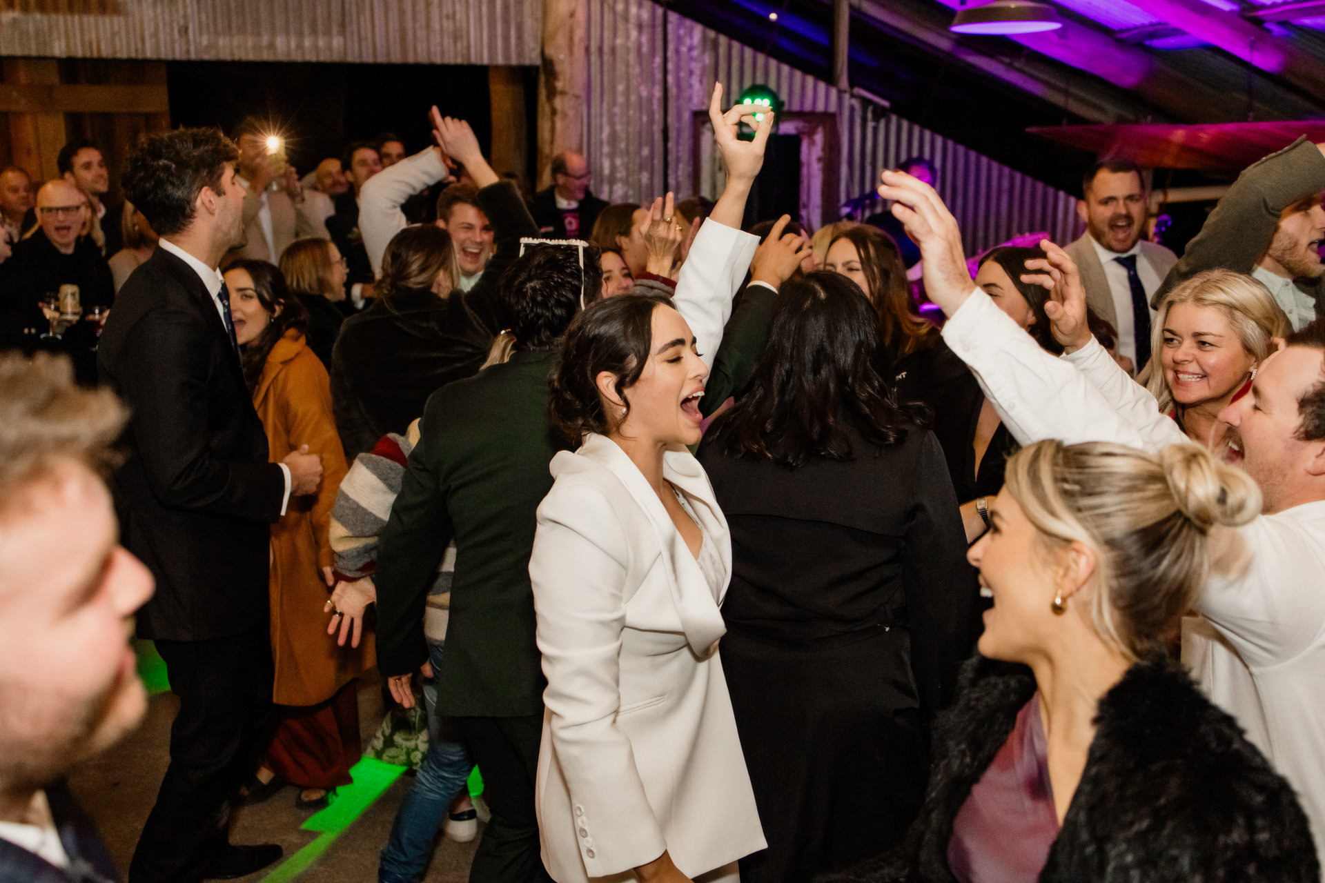 Before we all went inside the barn, we made a line of guests to get a quick photo with the happy couple to some upbeat music—each couple had 15 seconds to strike a pose, and it was a chaotic blast! Dinner was served, followed by speeches that had Reuben on an emotional rollercoaster again. As the night cooled, the fire was lit, and the newlyweds exited through a sparkler tunnel—a perfect moment for Caitlin to slip away to change into a stylish white pant suit. They returned to cut their unique cheese round cake (extra sauce) before their first dance, which quickly turned into a flash mob – super saucey!