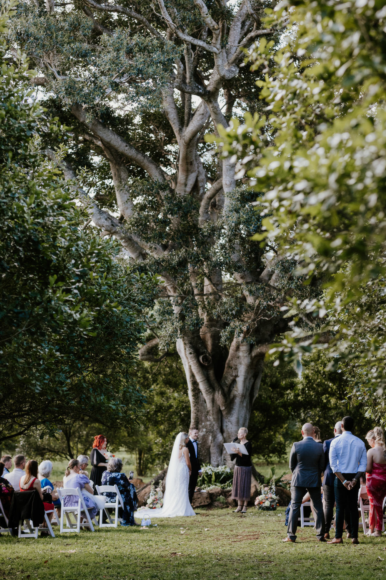 The ceremony itself took place under a massive tree in the middle of the macadamia rows, with the warm October sun casting a soft glow over everything. The simplicity of the setup—just a few rows of chairs for their closest family and friends, and some delicate flowers—let the natural beauty of the surroundings speak for itself. As the guests settled in, the flower girls and page boy made their entrance, looking absolutely adorable but needing a bit of encouragement to make it down the aisle, much to everyone’s amusement. It was one of those charming moments that had everyone smiling and set the tone for the relaxed, joyful day ahead.