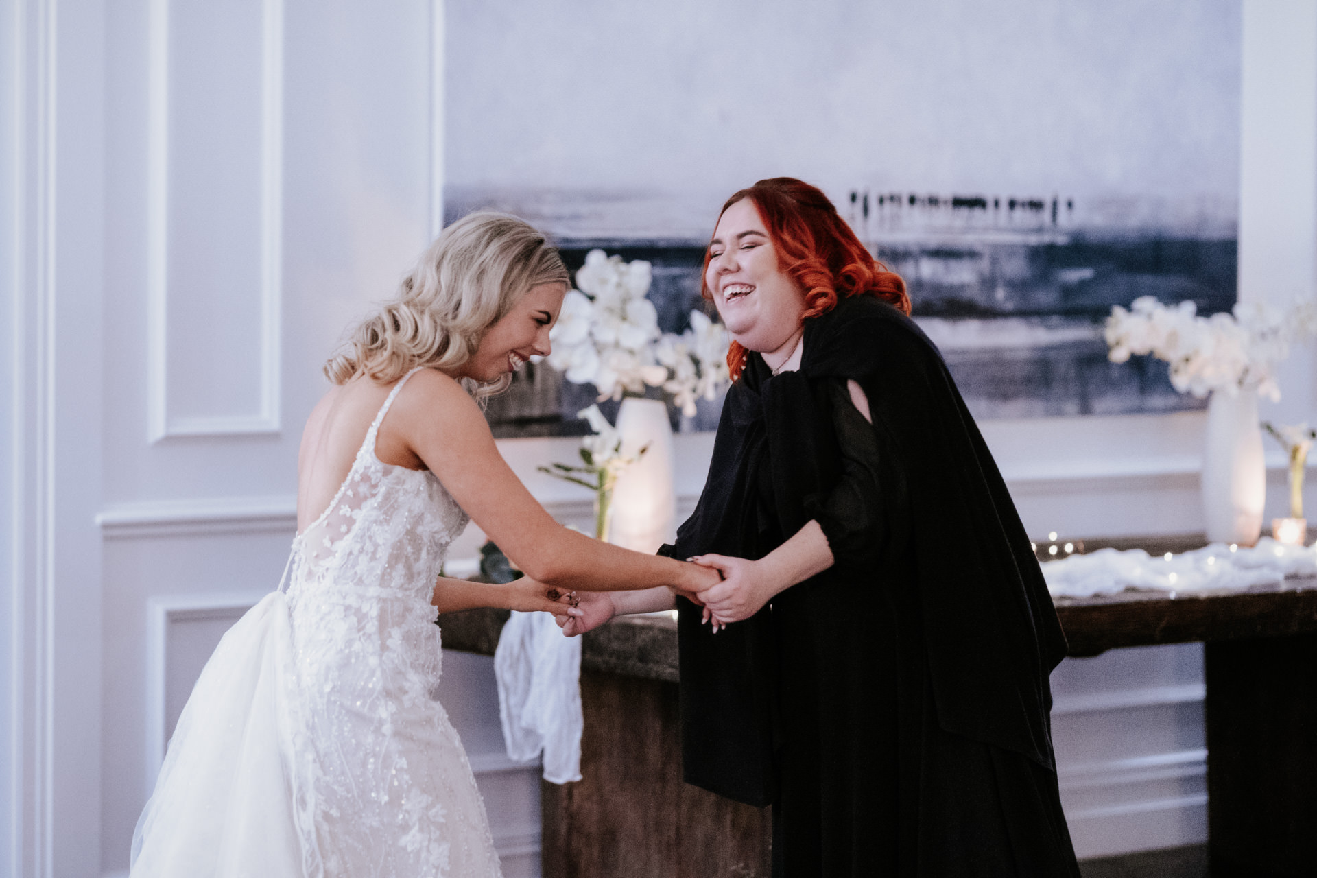 When Felicity appeared, her smile seemed to light up the entire space and as she walked down the aisle, Andrew couldn’t take his eyes off her. The connection between them was undeniable, and as they shared their vows, it was clear how deeply they cared for each other. Their words were personal, full of love, a couple of giggles and had more than a few guests dabbing their eyes. As they exchanged rings and sealed their promises with a kiss, the small group of guests erupted in cheers.