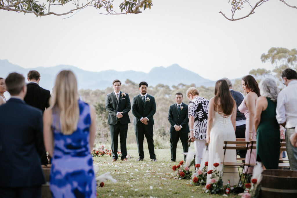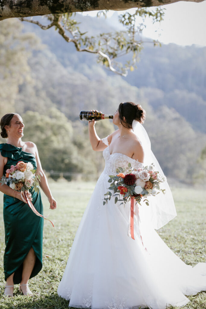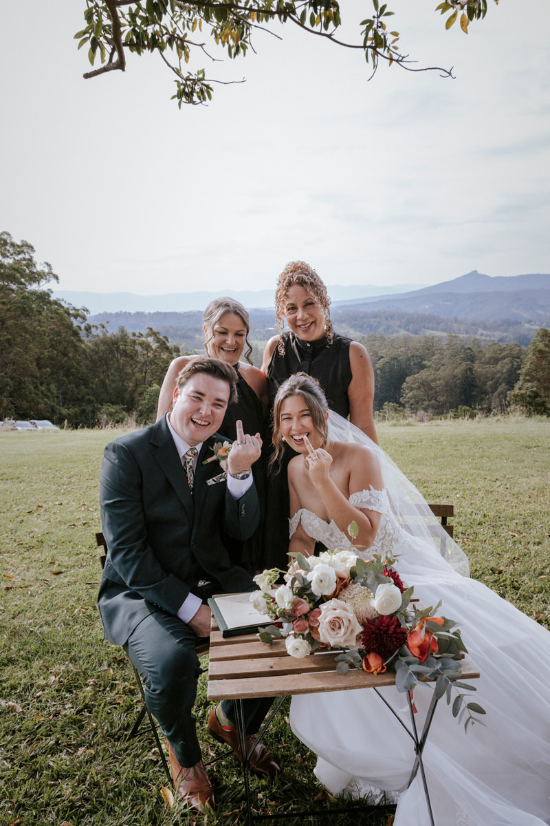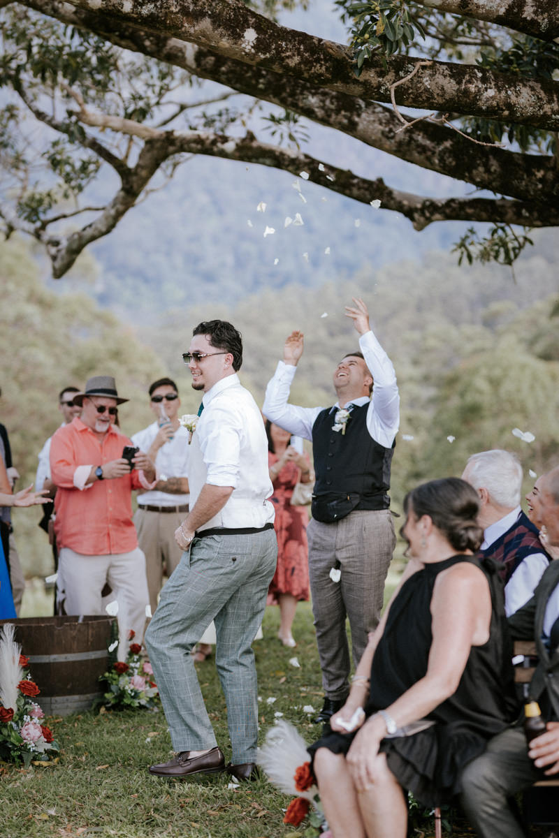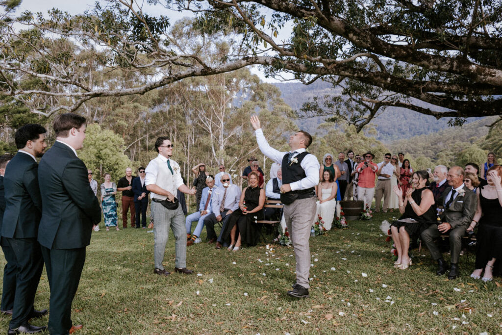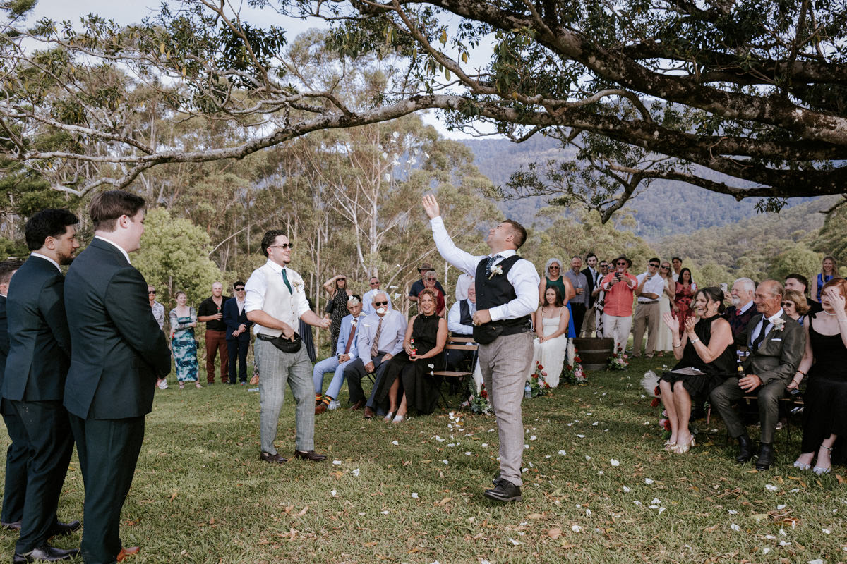 The ceremony setting? Absolutely breathtaking. Under the massive fig tree overlooking the Tweed Valley – it doesn’t get much better. Adding a twist of humour, Marley’s brother and cousin stepped in as “flower men,” complete with bumbags full of petals, showering guests as they strutted down the aisle. The crowd loved it.