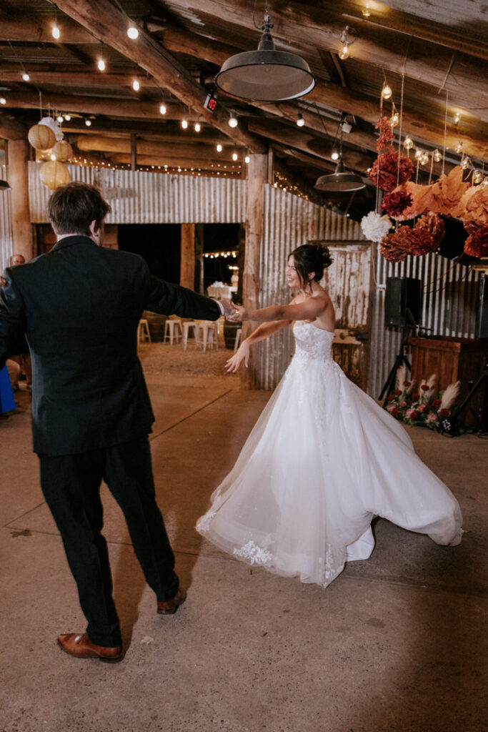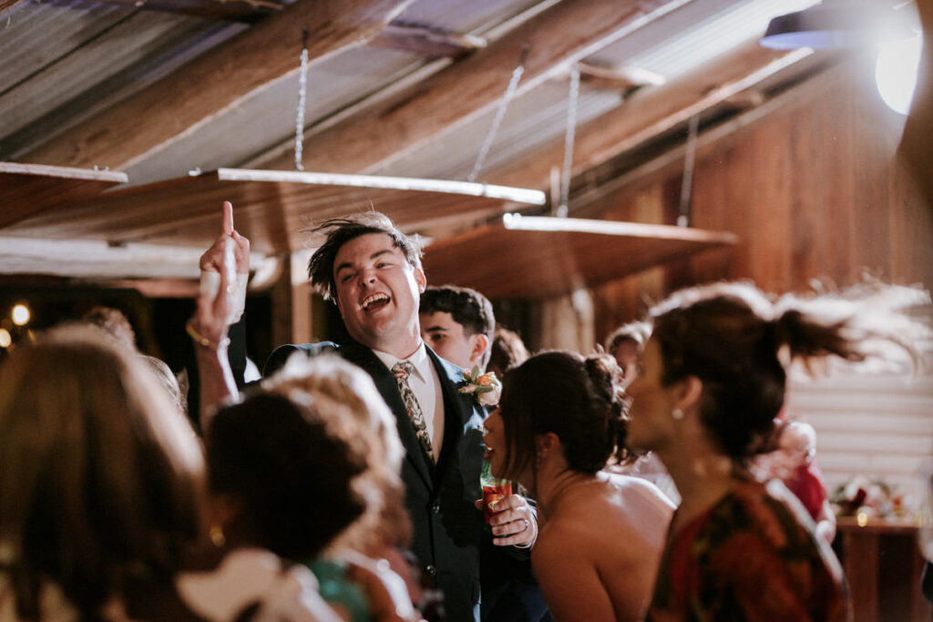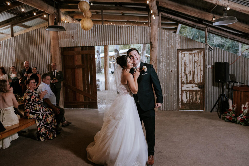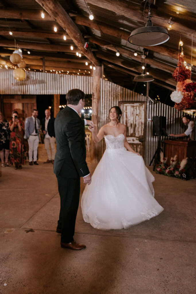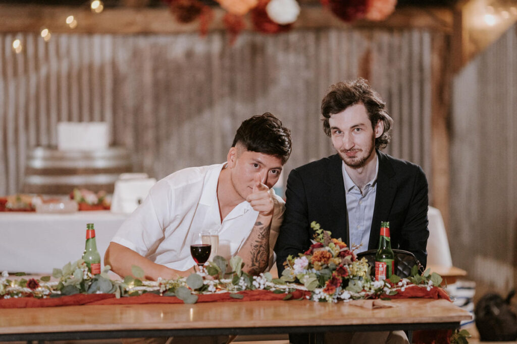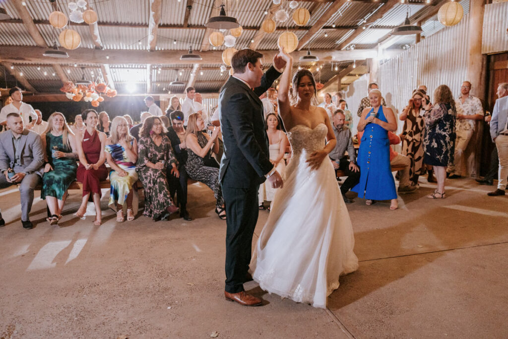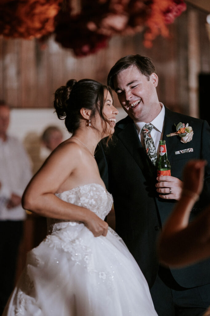 Back at the barn, it was time to turn up the party. The couple made their grand entrance, bursting in with a confetti cannon, greeted by huge cheers. The reception rolled on with speeches that were equal parts heartfelt and hilarious, then dinner, cake cutting, and the first dance. Halfway through their dance, guests joined them on the dancefloor, and from there the music pumped, the shoes came off, and the party truly began.