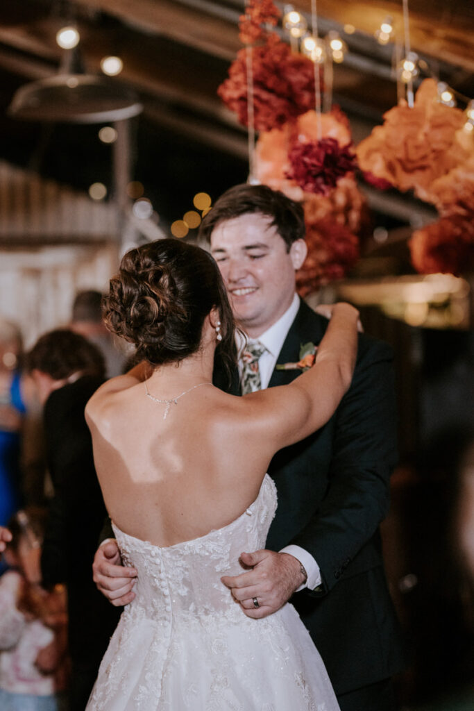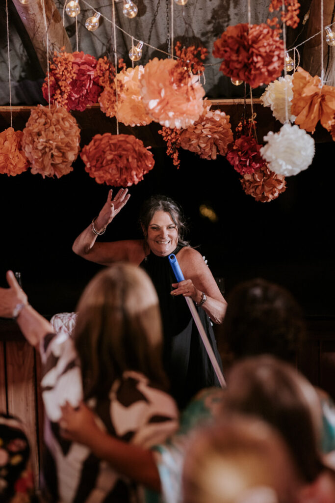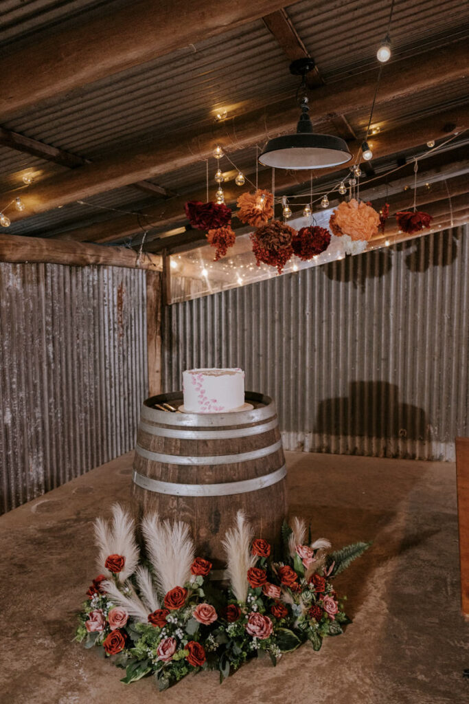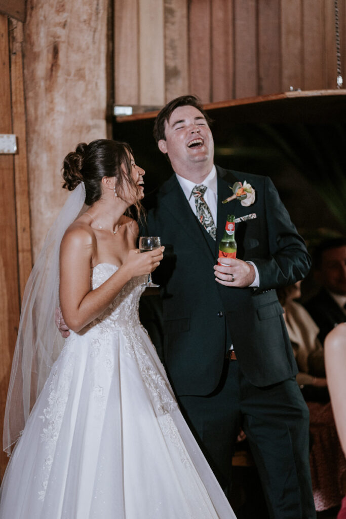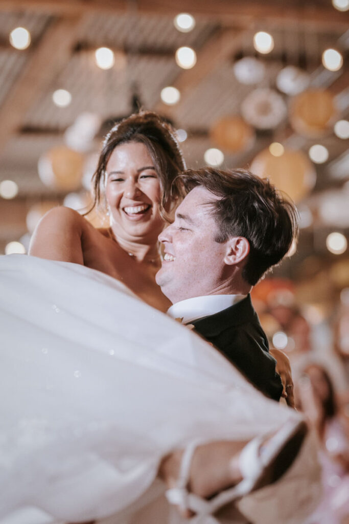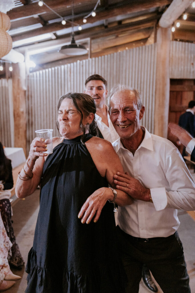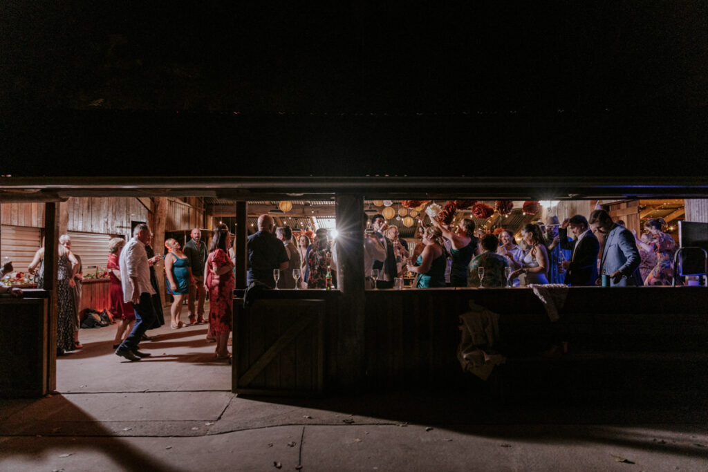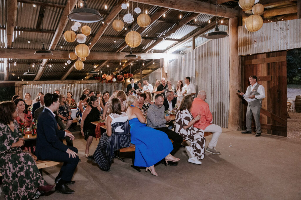 Back at the barn, it was time to turn up the party. The couple made their grand entrance, bursting in with a confetti cannon, greeted by huge cheers. The reception rolled on with speeches that were equal parts heartfelt and hilarious, then dinner, cake cutting, and the first dance. Halfway through their dance, guests joined them on the dancefloor, and from there the music pumped, the shoes came off, and the party truly began.
