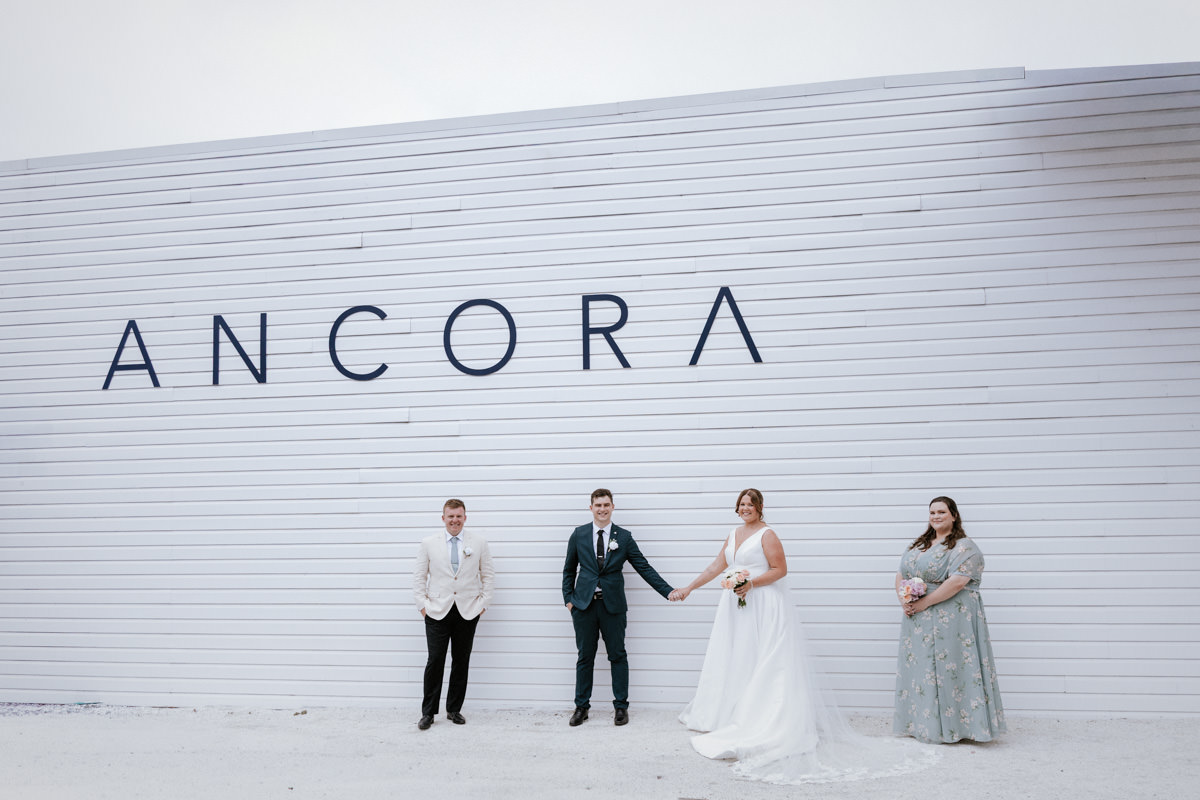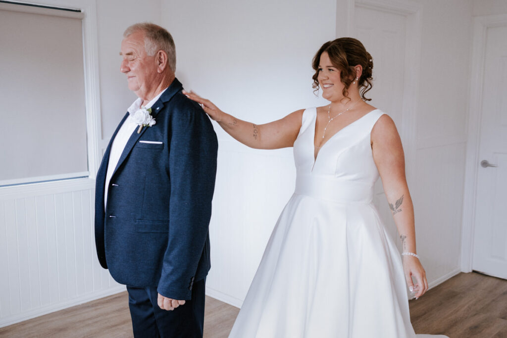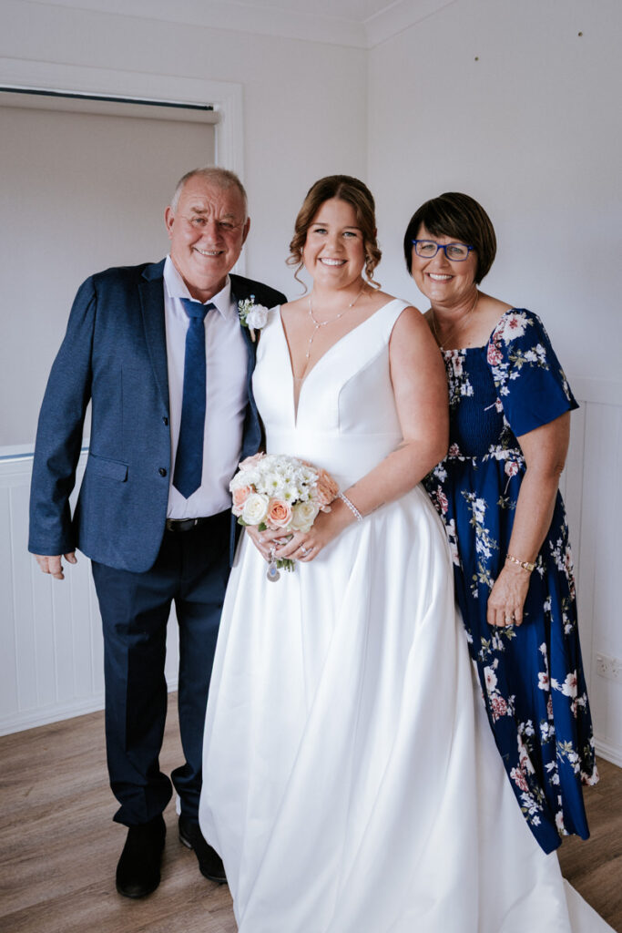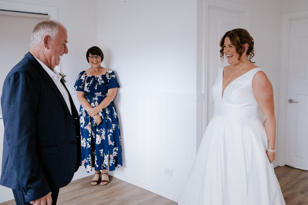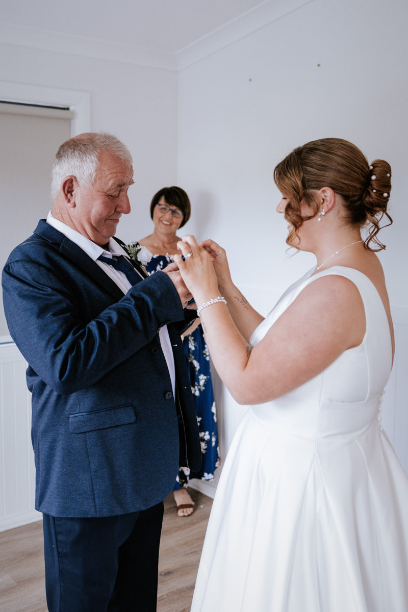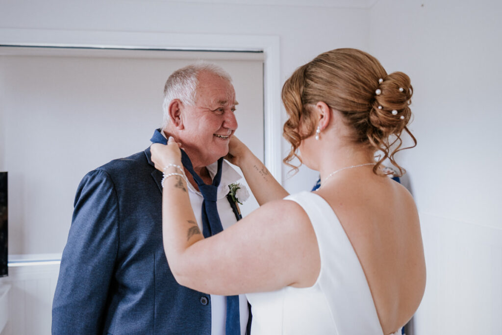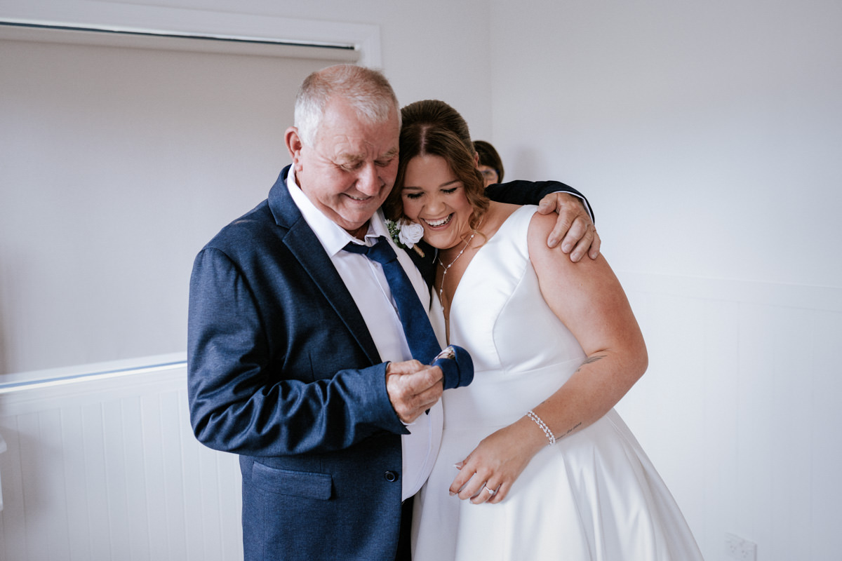 By then it was time for Tegan to step into her dress. It was a beautiful, quiet moment with just her mum and maid of honour helping. Once she was ready, she headed out to show her dad the dress, and she’d organised a special tie for him too, a really touching gesture. We grabbed a few photos of Tegan with her parents, then a few portraits of her on her own before it was time to head to Ancora.