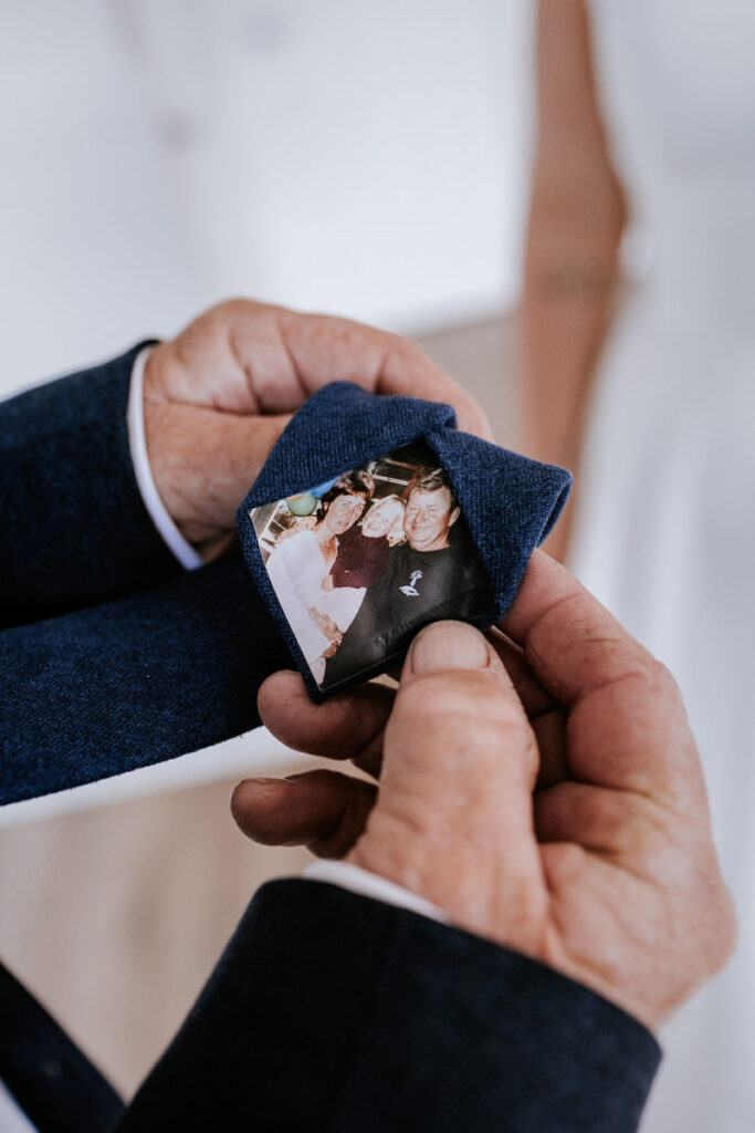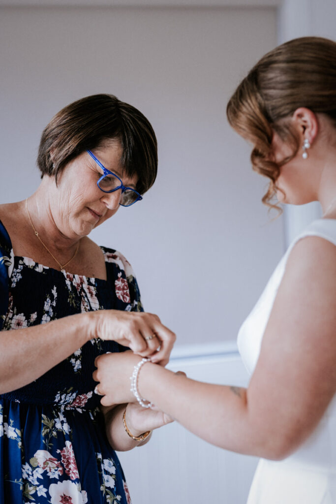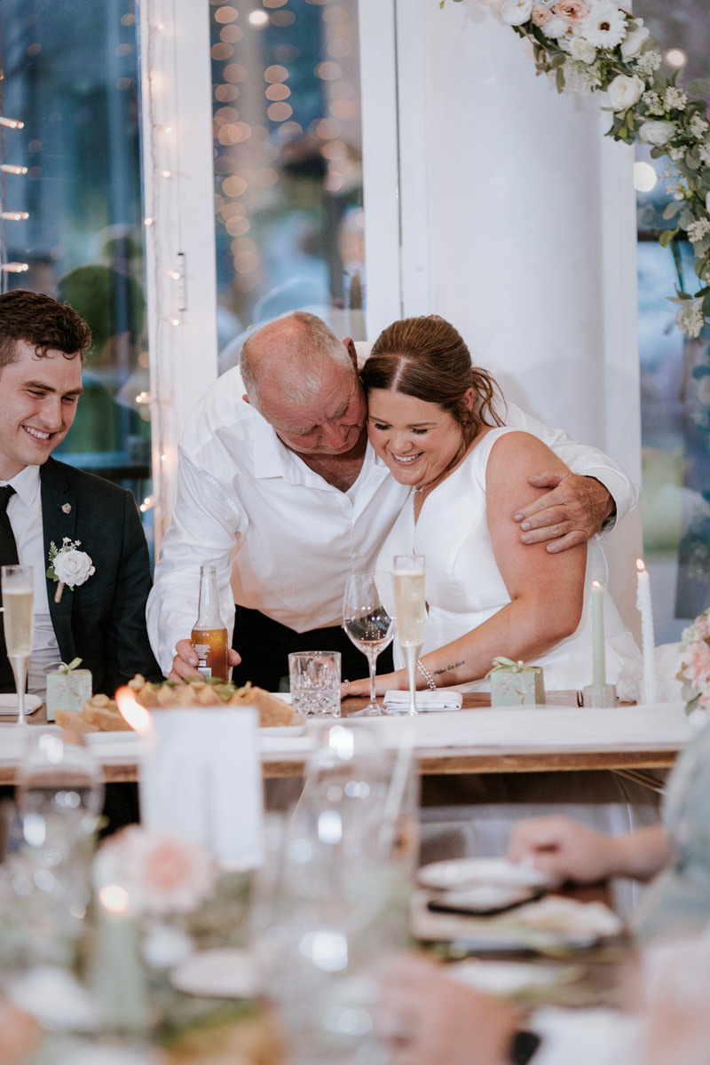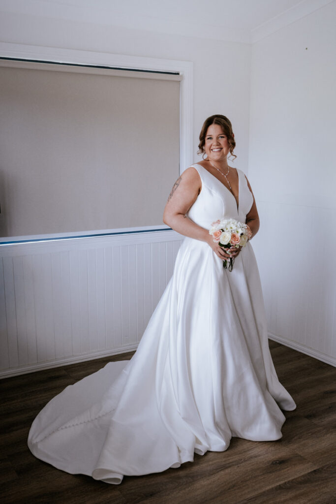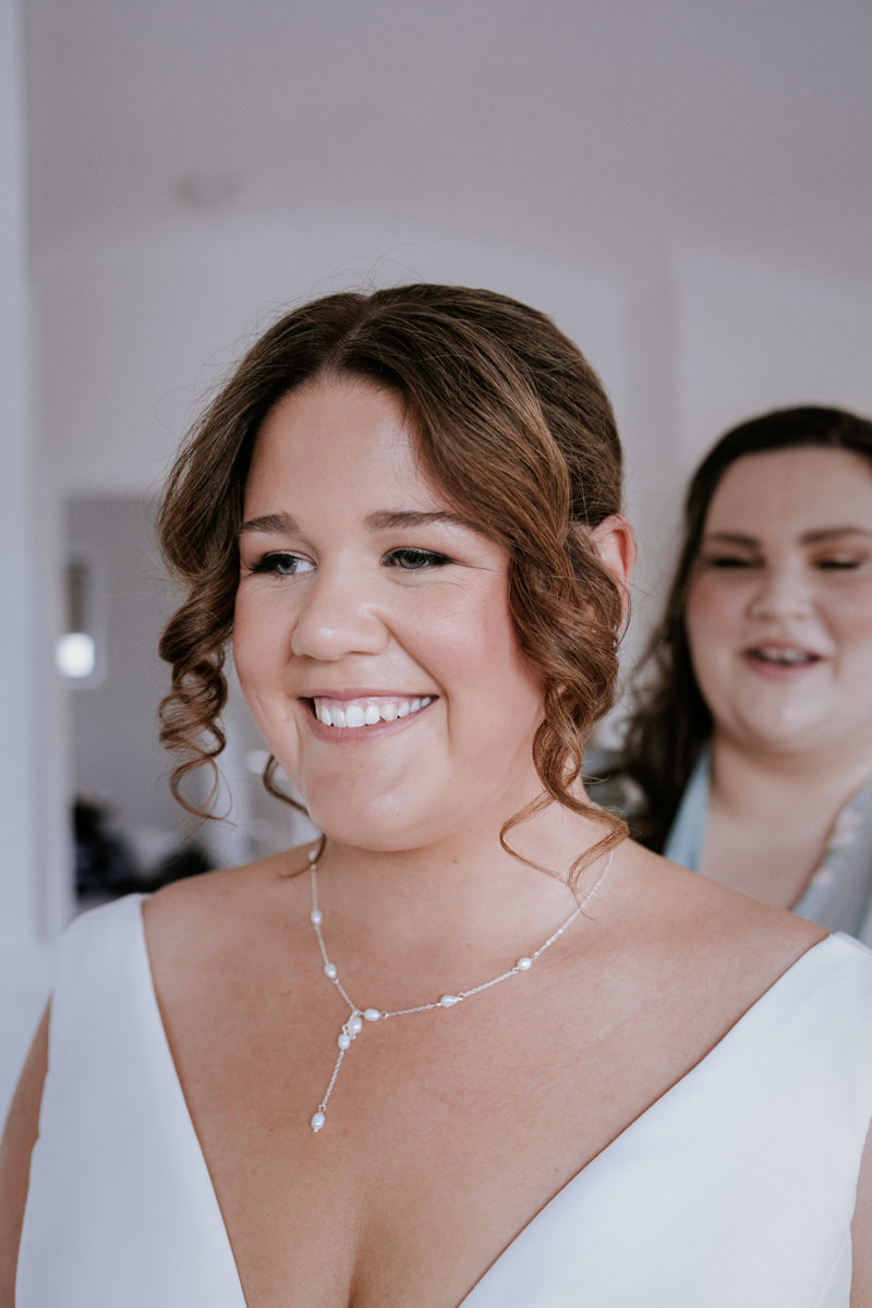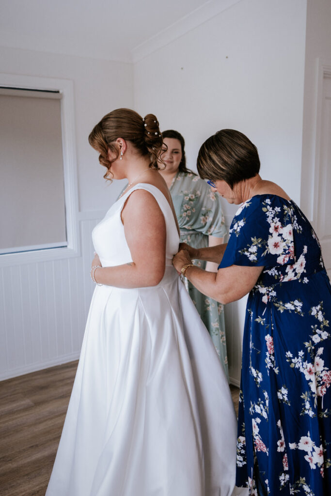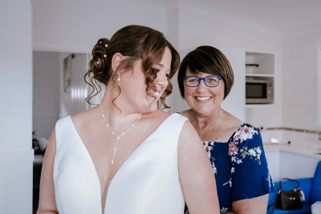 By then it was time for Tegan to step into her dress. It was a beautiful, quiet moment with just her mum and maid of honour helping. Once she was ready, she headed out to show her dad the dress, and she’d organised a special tie for him too, a really touching gesture. We grabbed a few photos of Tegan with her parents, then a few portraits of her on her own before it was time to head to Ancora.