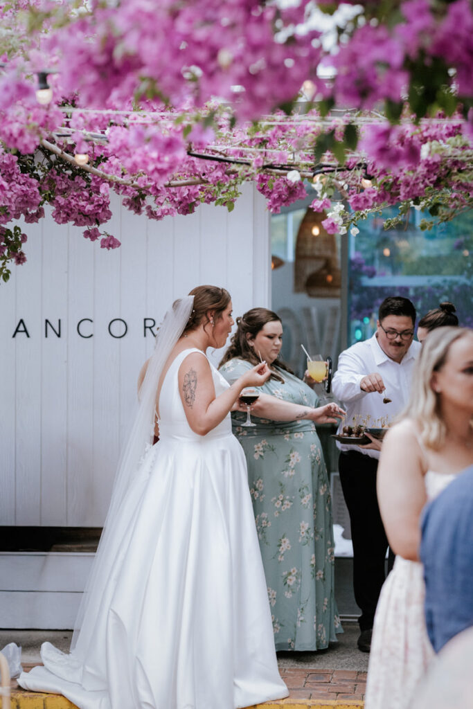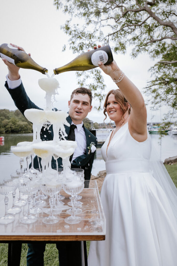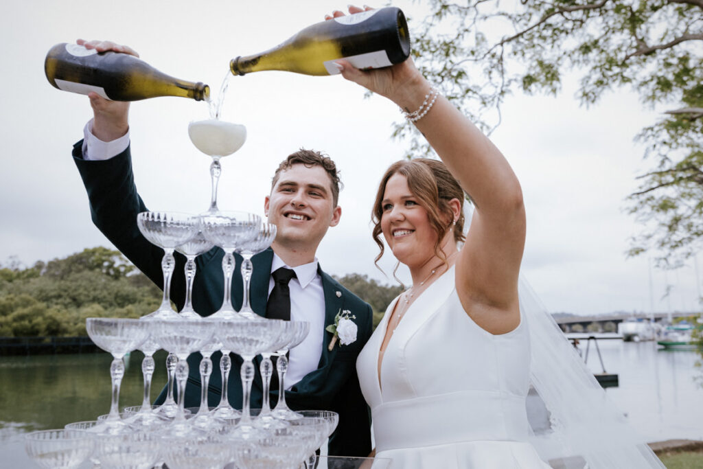 After they walked back down the aisle there were hugs everywhere, followed by a big group photo and some quick family shots. Guests headed off to cocktail hour while I took the bridal party for a wander around the venue for some relaxed photos. When we joined everyone again, it was straight into a champagne tower – always a good time – before everyone settled into drinks and canapés.
