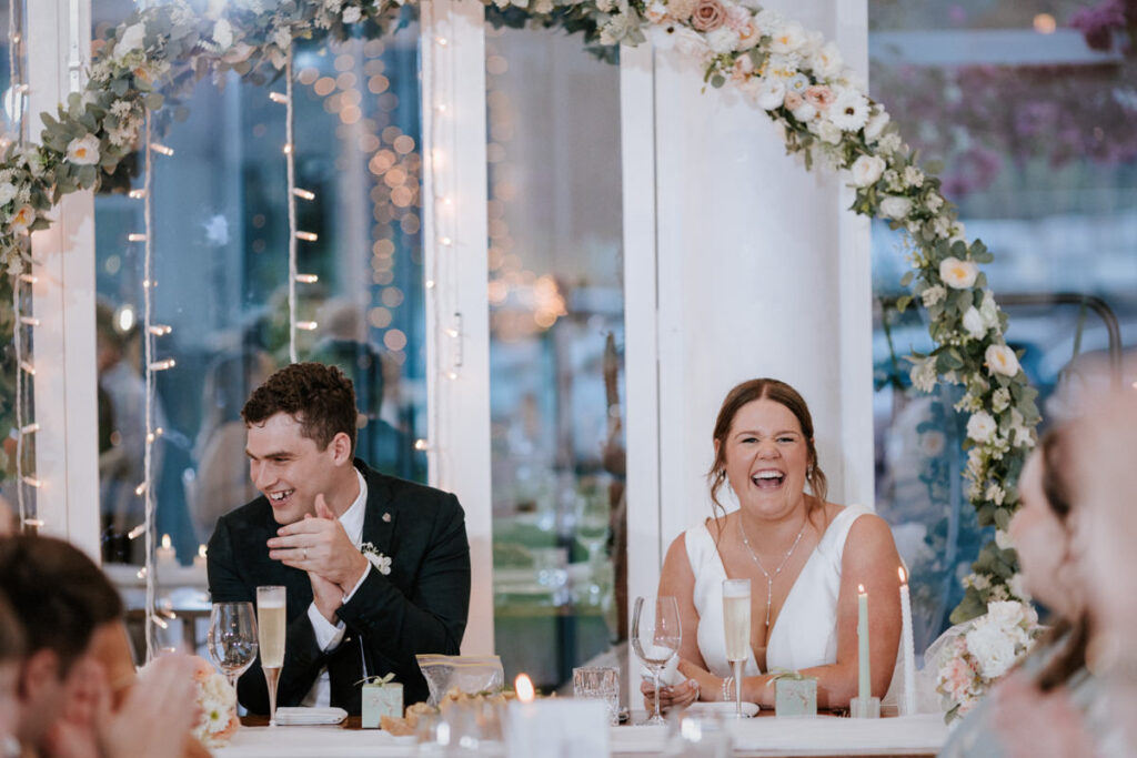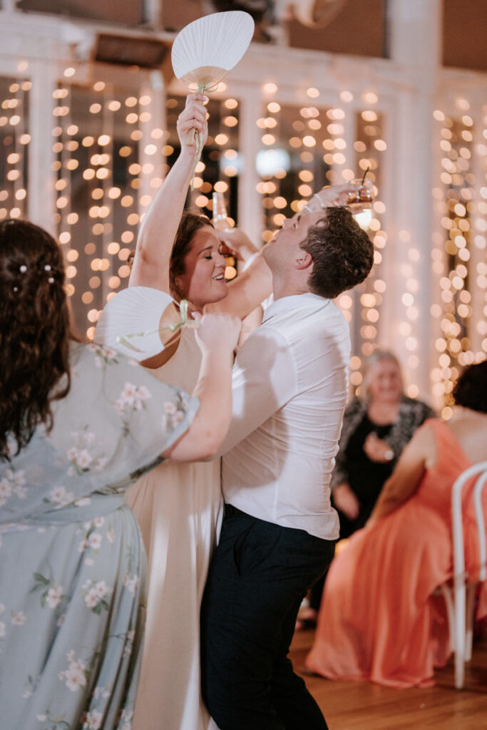 When they returned, they entered the reception in true celebration mode – music pumping, guests cheering, the energy instantly lifted and straight into cake cutting. Speeches followed, full of love and a fair bit of roasting (the good kind). Then dinner followed their first dance. Halfway through, guests joined them, and once DJ Cassidy took over the music, the dancefloor came alive. These two have an incredible crew, everyone absolutely went for it.