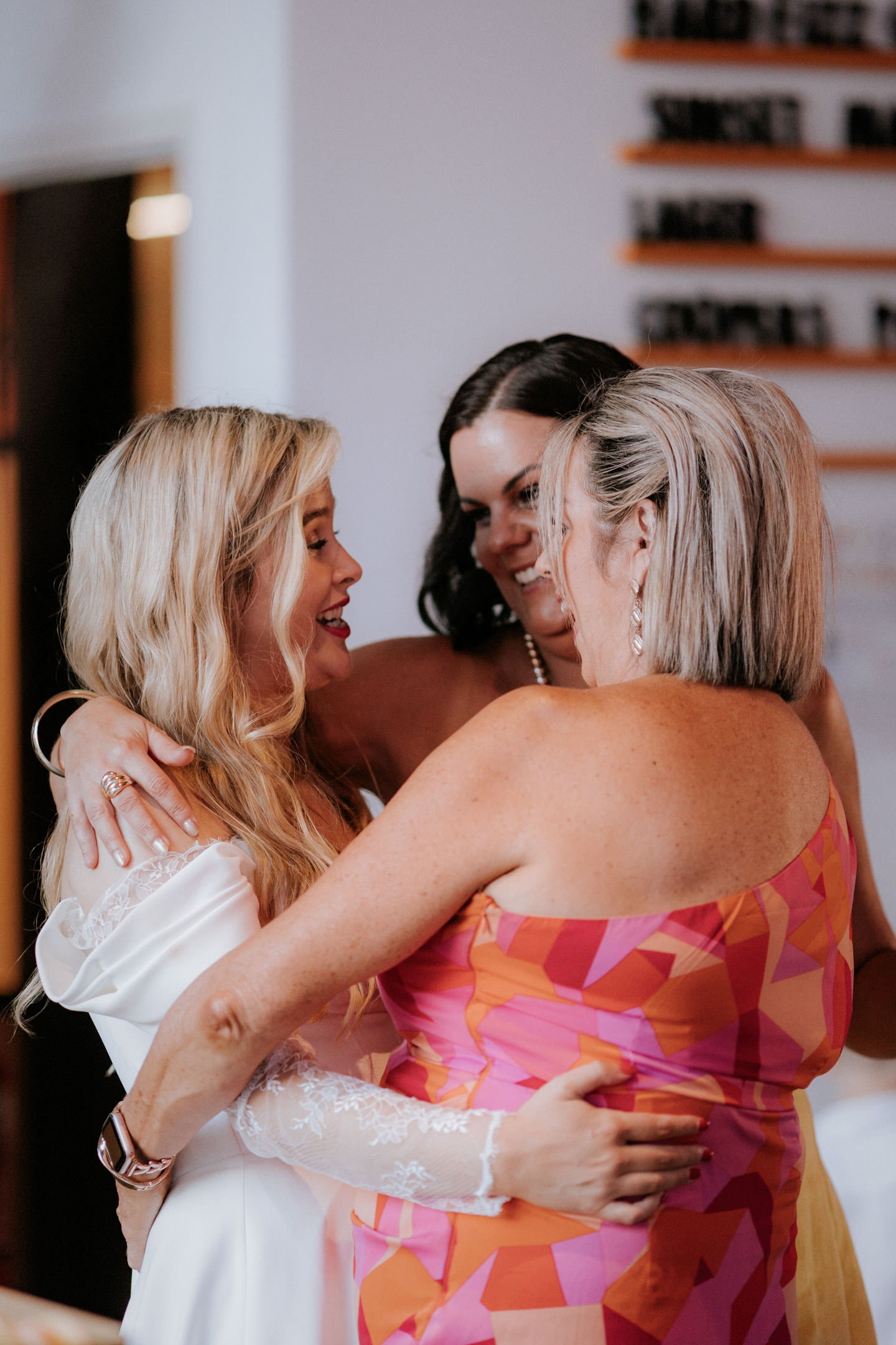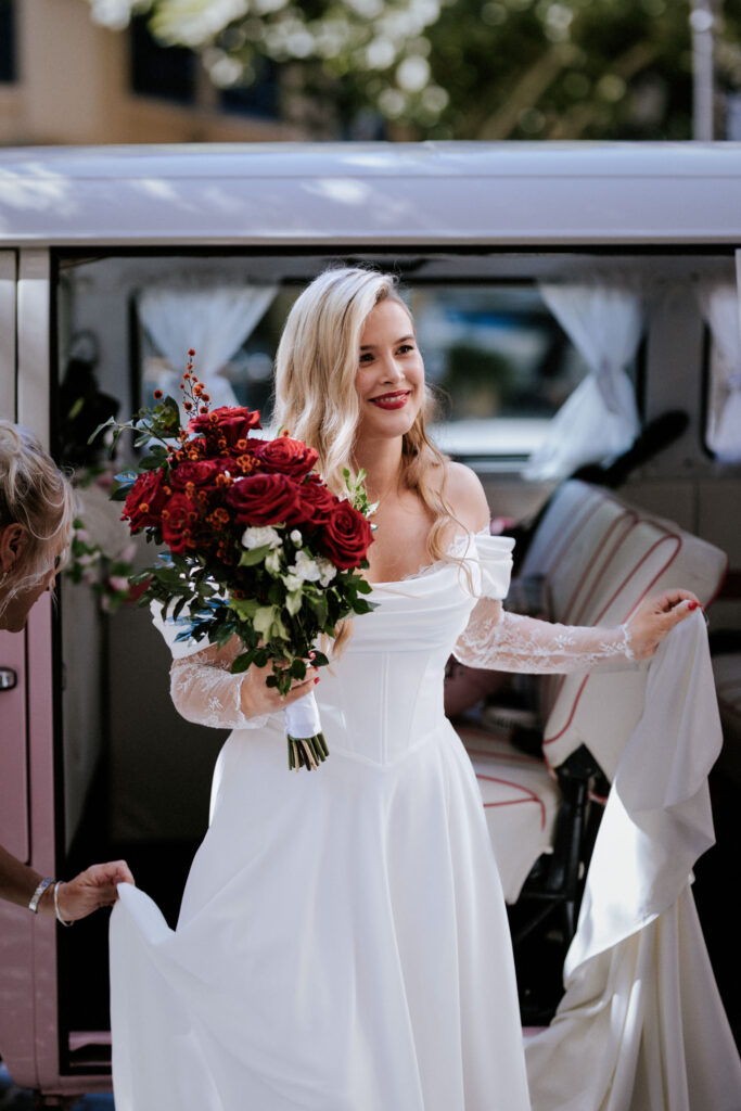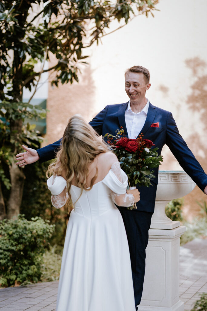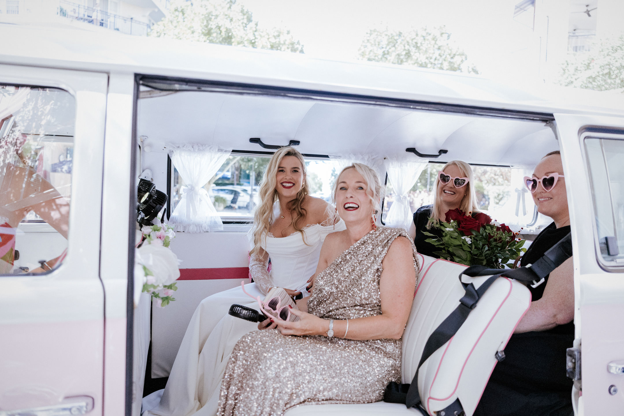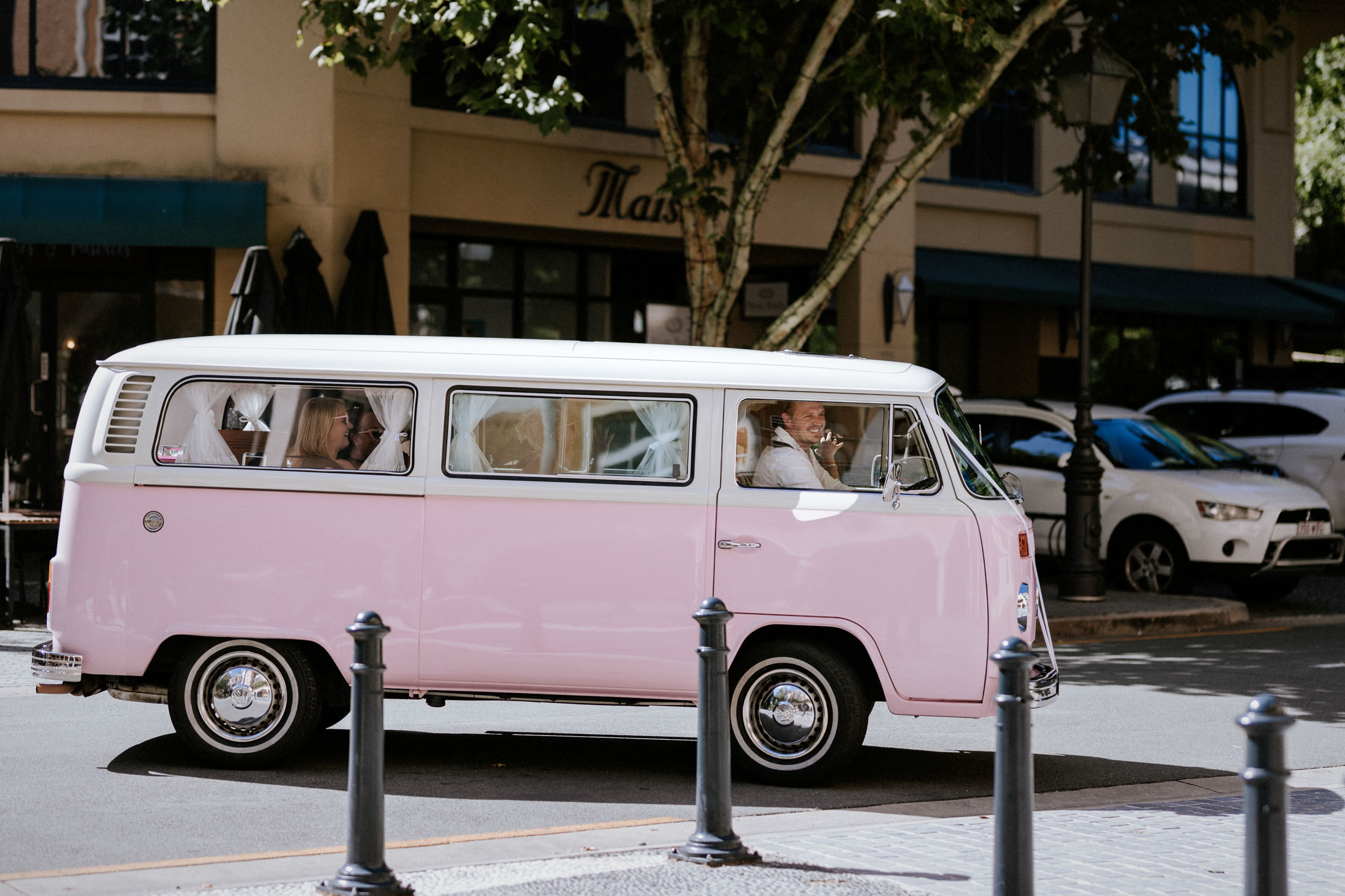 Not long after, it was Tessa’s turn to arrive, pulling up in a pink Combi and looking incredible. Bruno had tucked himself away in a little alcove so he could not see her coming. Tessa made her way over and tapped him on the shoulder for their first look. When he turned around, the smiles said everything. Such a good moment, followed by plenty of hugs and excitement from everyone nearby.