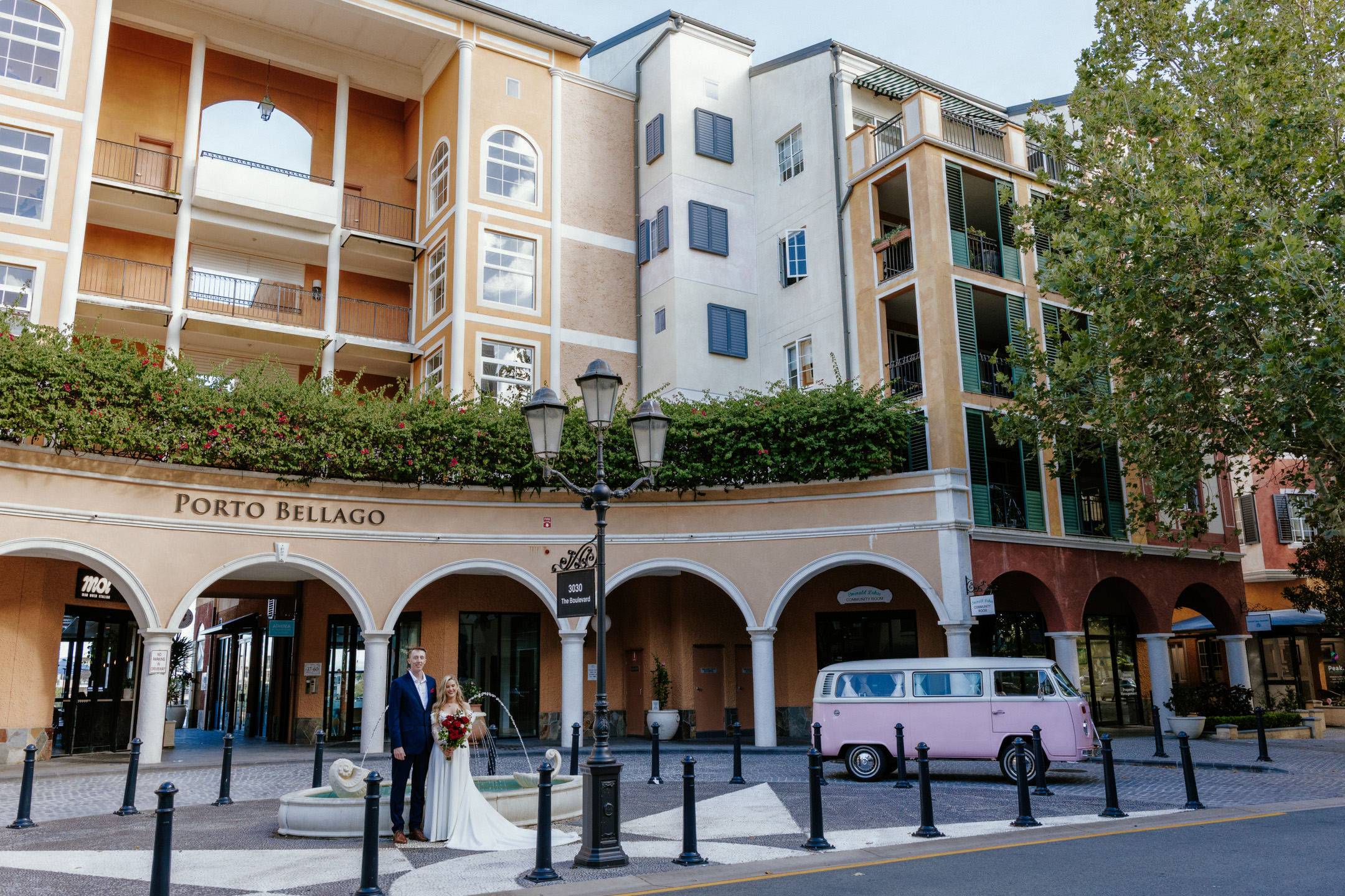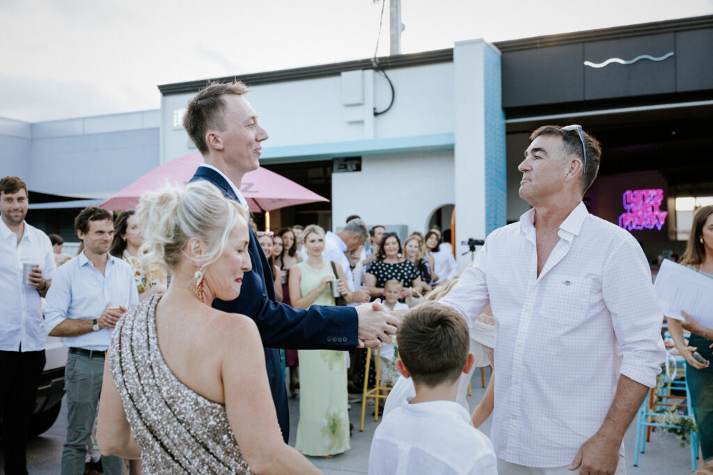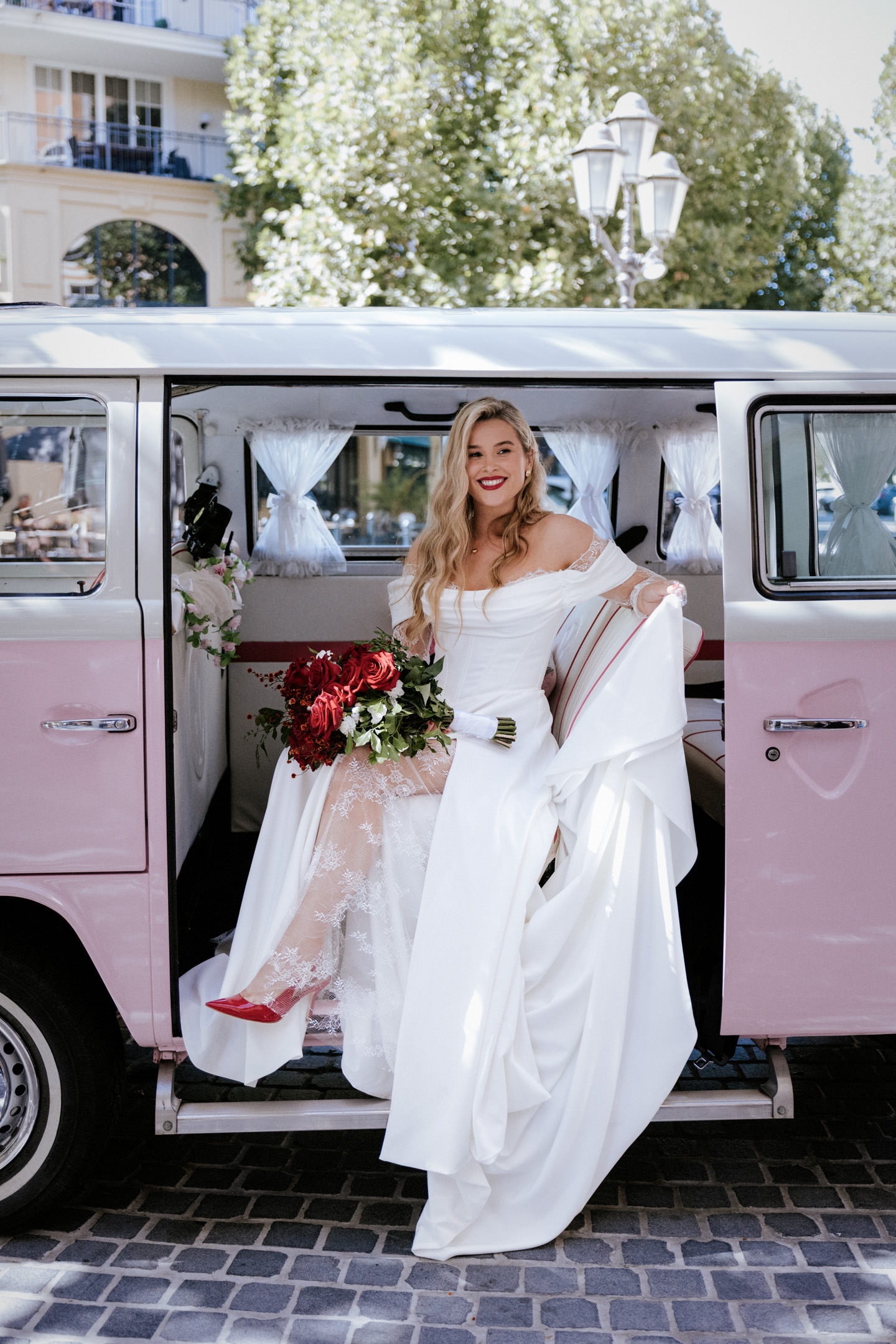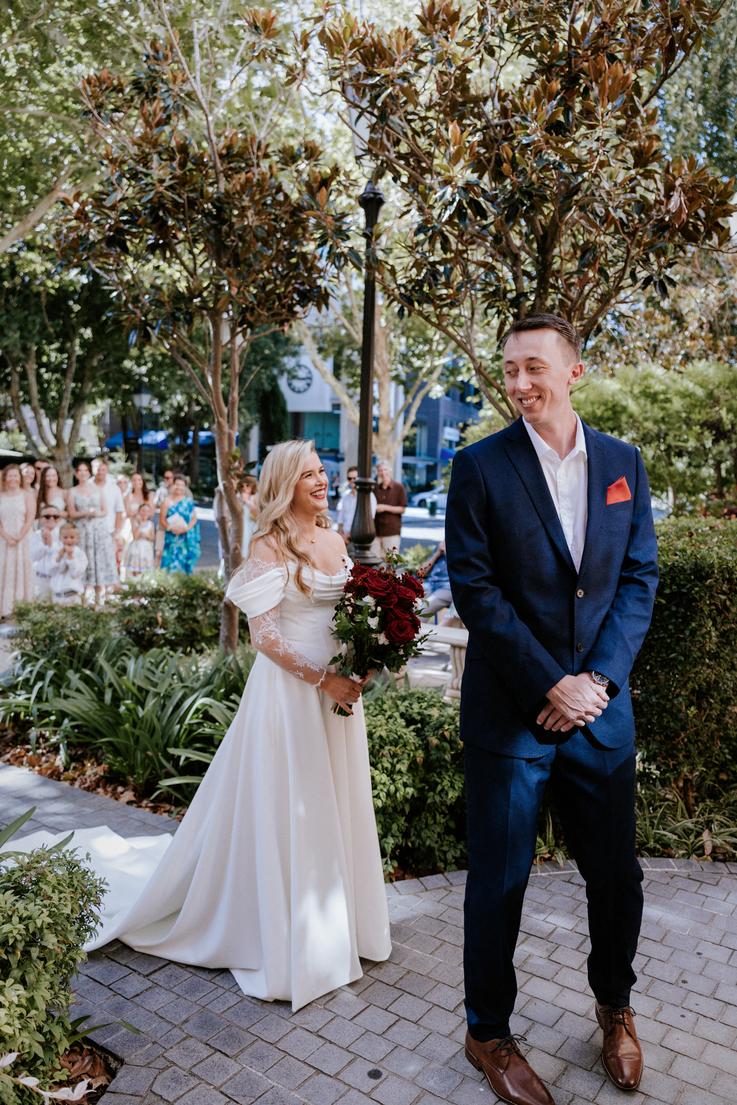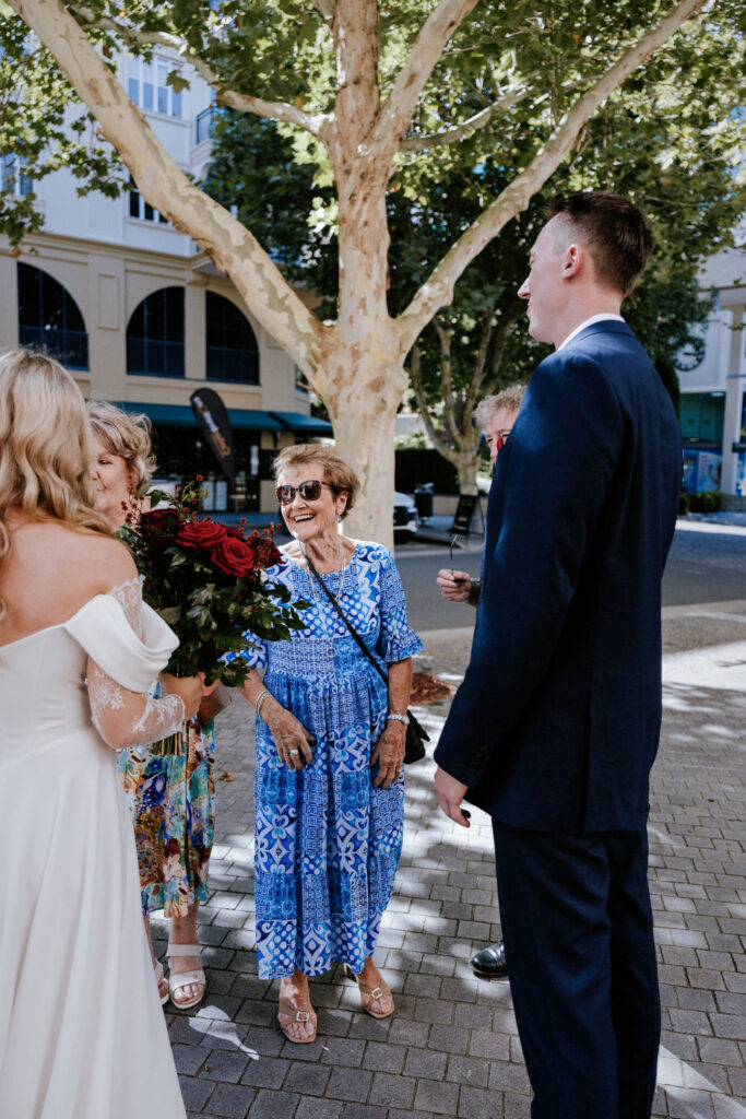 Not long after, it was Tessa’s turn to arrive, pulling up in a pink Combi and looking incredible. Bruno had tucked himself away in a little alcove so he could not see her coming. Tessa made her way over and tapped him on the shoulder for their first look. When he turned around, the smiles said everything. Such a good moment, followed by plenty of hugs and excitement from everyone nearby.