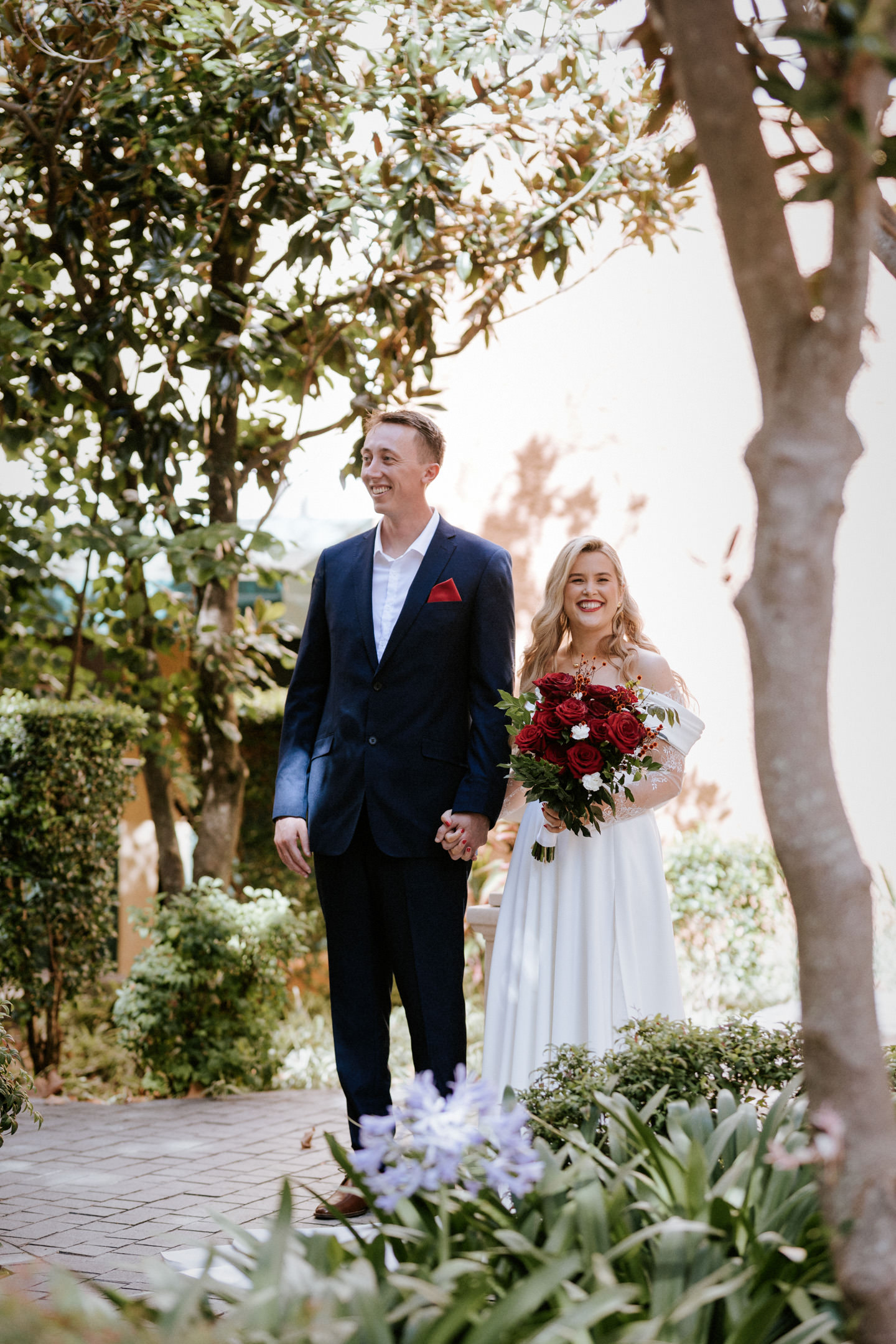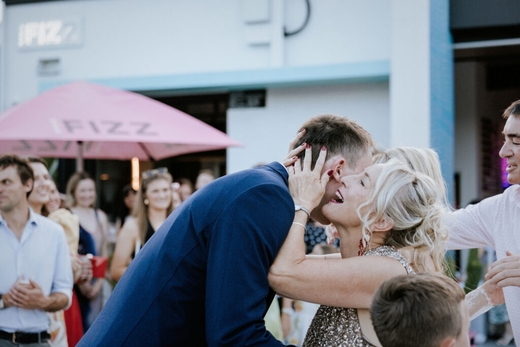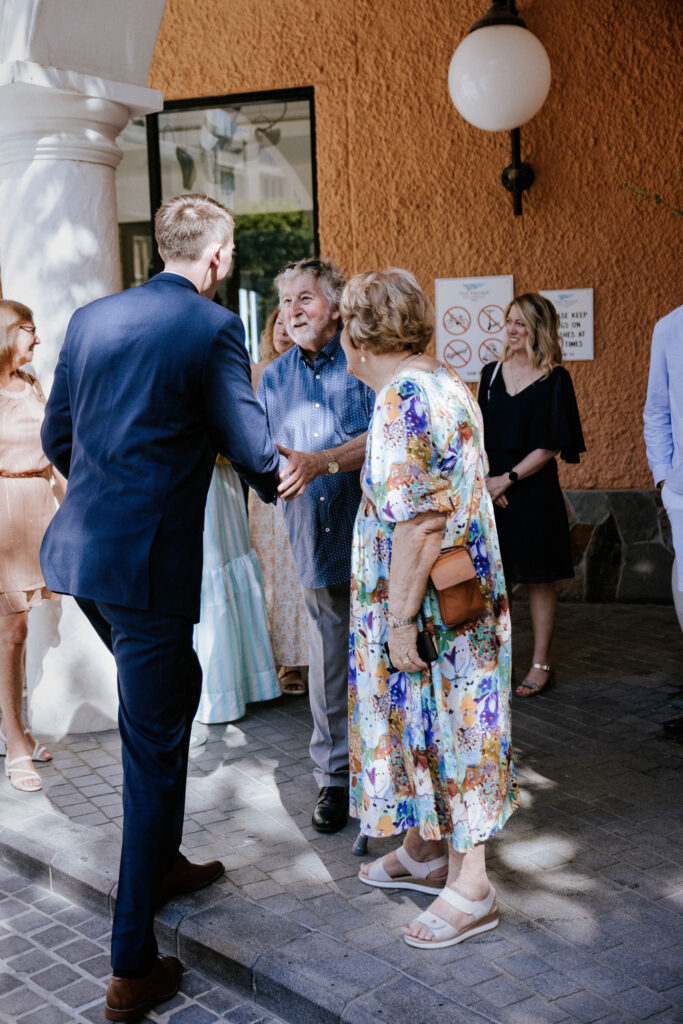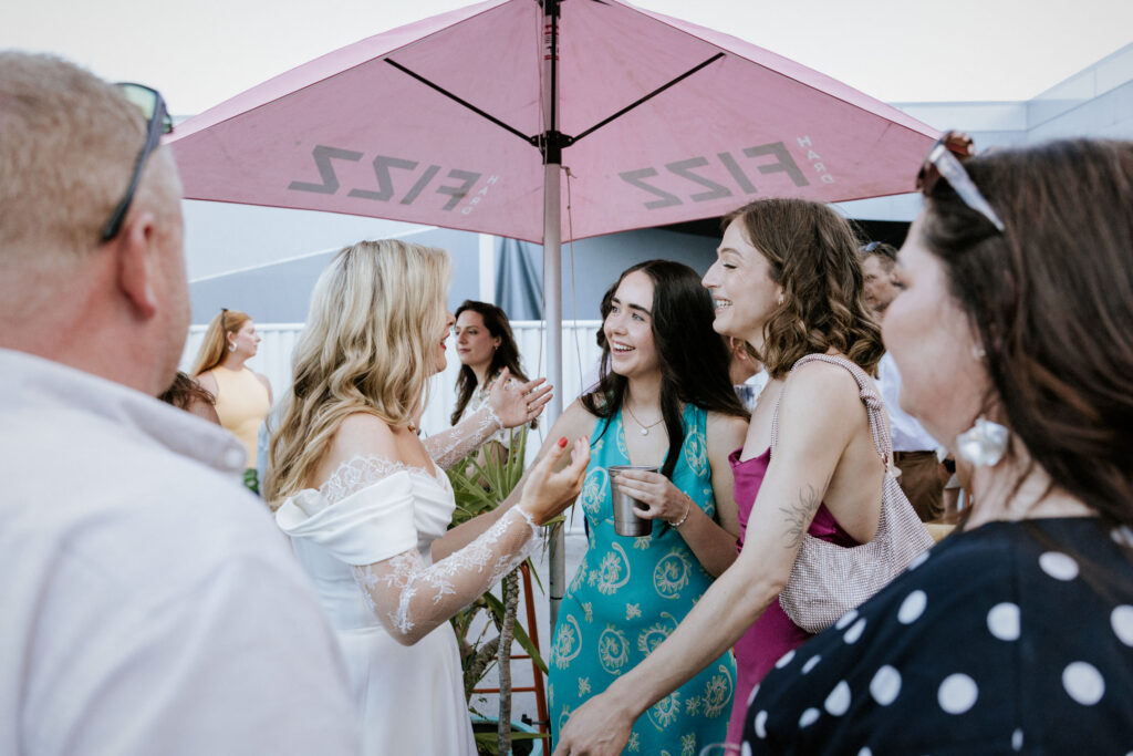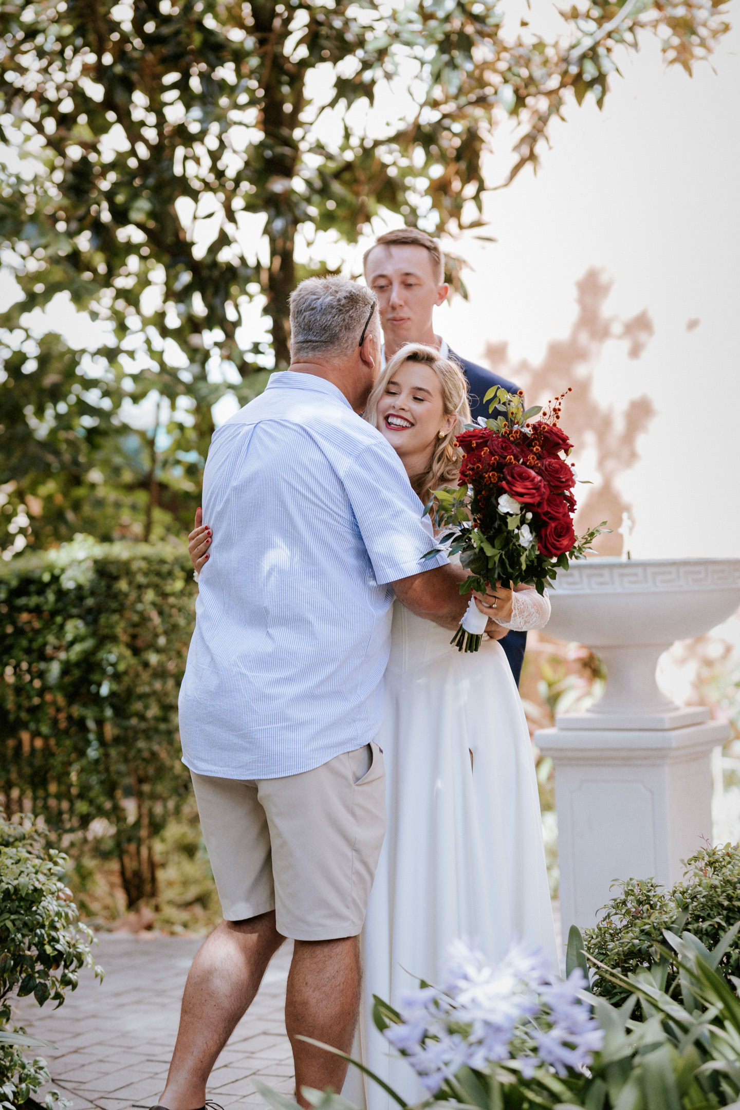 Not long after, it was Tessa’s turn to arrive, pulling up in a pink Combi and looking incredible. Bruno had tucked himself away in a little alcove so he could not see her coming. Tessa made her way over and tapped him on the shoulder for their first look. When he turned around, the smiles said everything. Such a good moment, followed by plenty of hugs and excitement from everyone nearby.