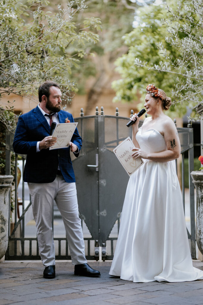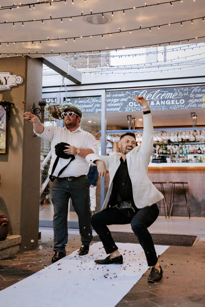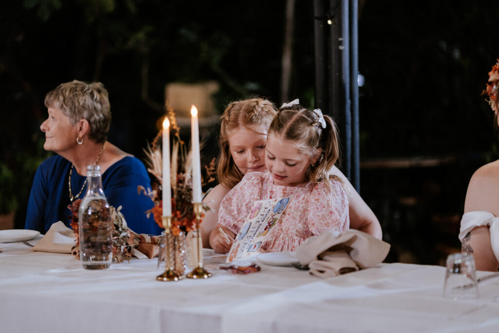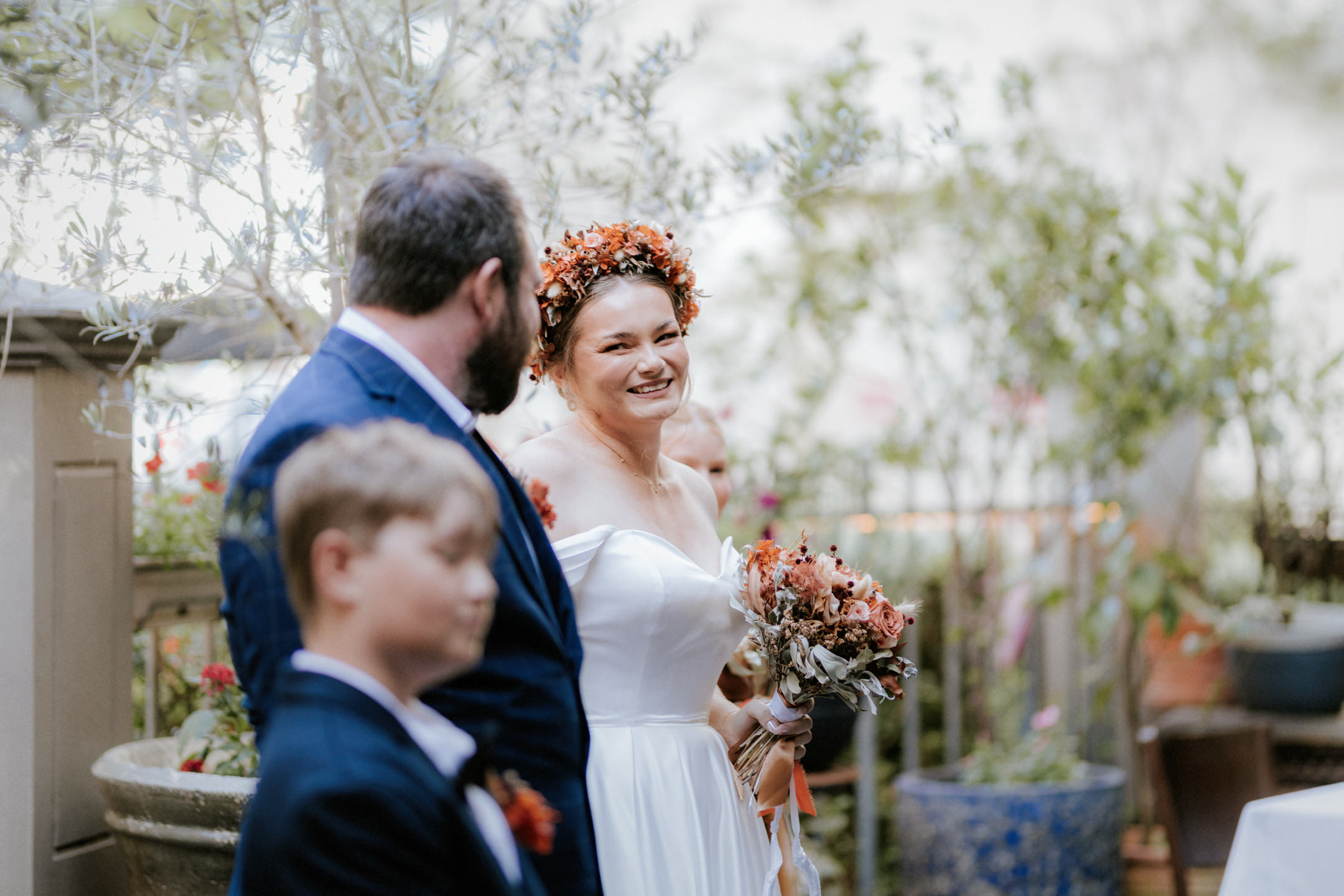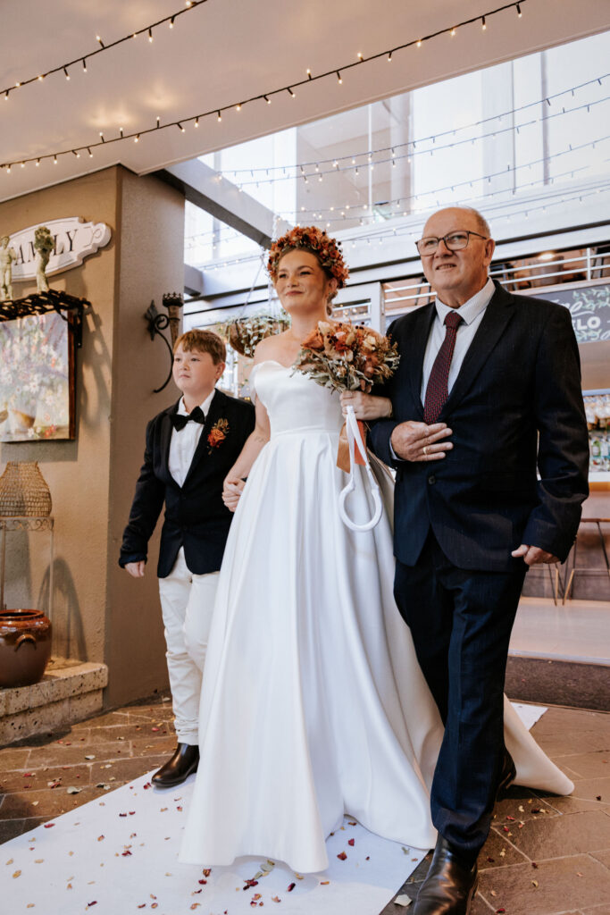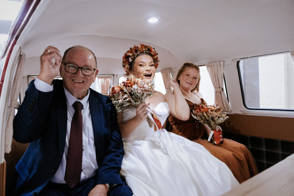 Guests gathered and the energy started to build as Maddy arrived in a kombi with her bridesmaid and dad. Then things kicked off with one of the more memorable entrances, the flower men led the way, armed with bum bags full of petals, throwing them out over the crowd and getting everyone laughing straight away. Not long after, Maddy made her entrance, walking down the aisle with her son and dad by her side. All eyes were on her, especially Keith’s.