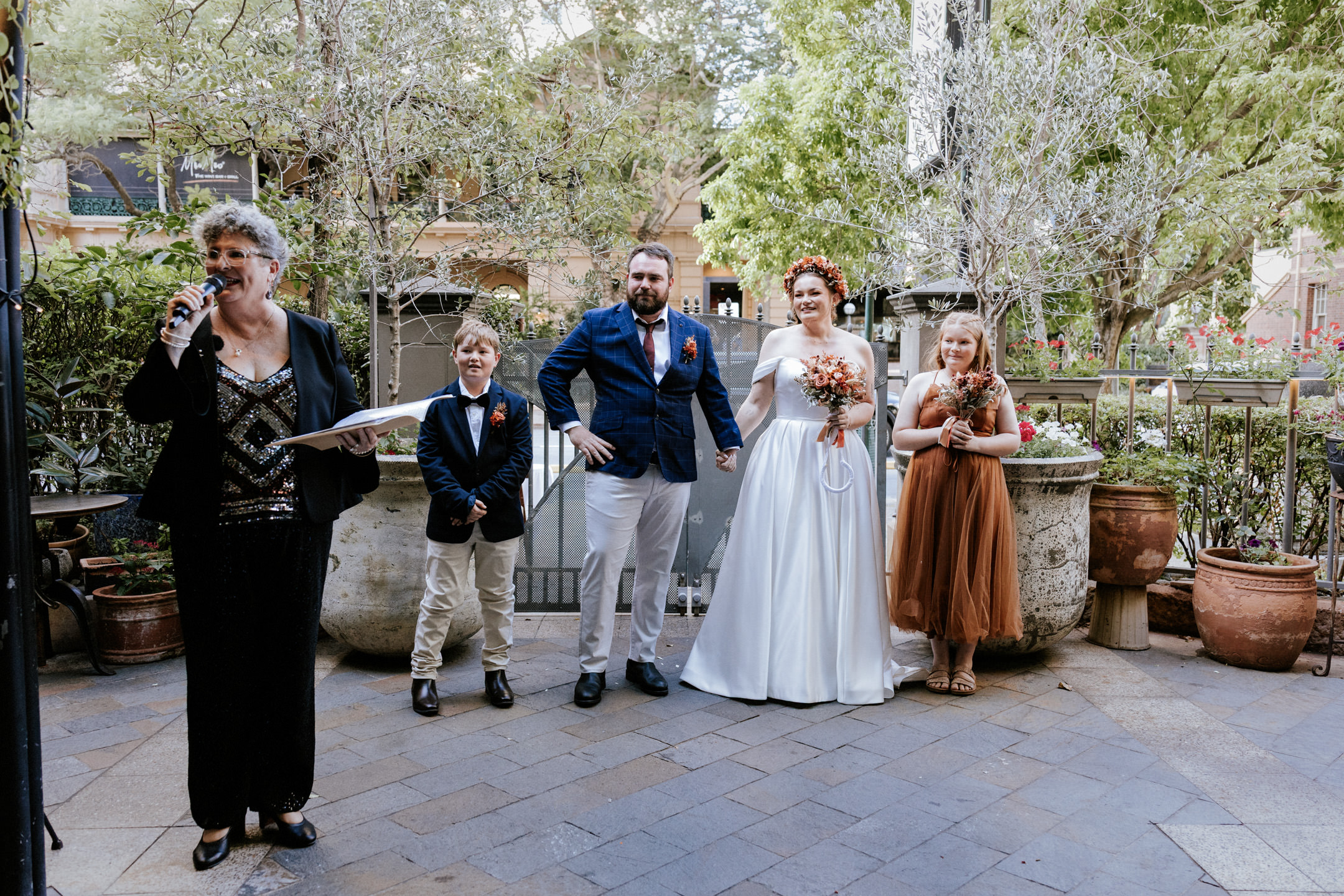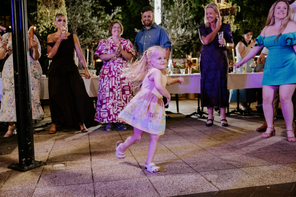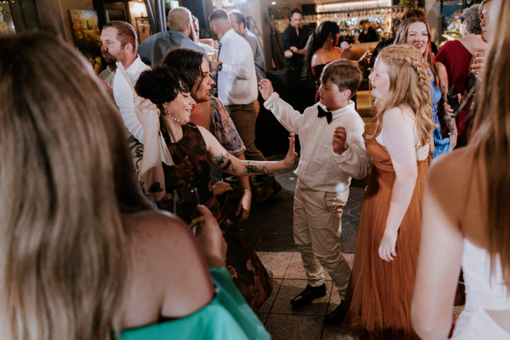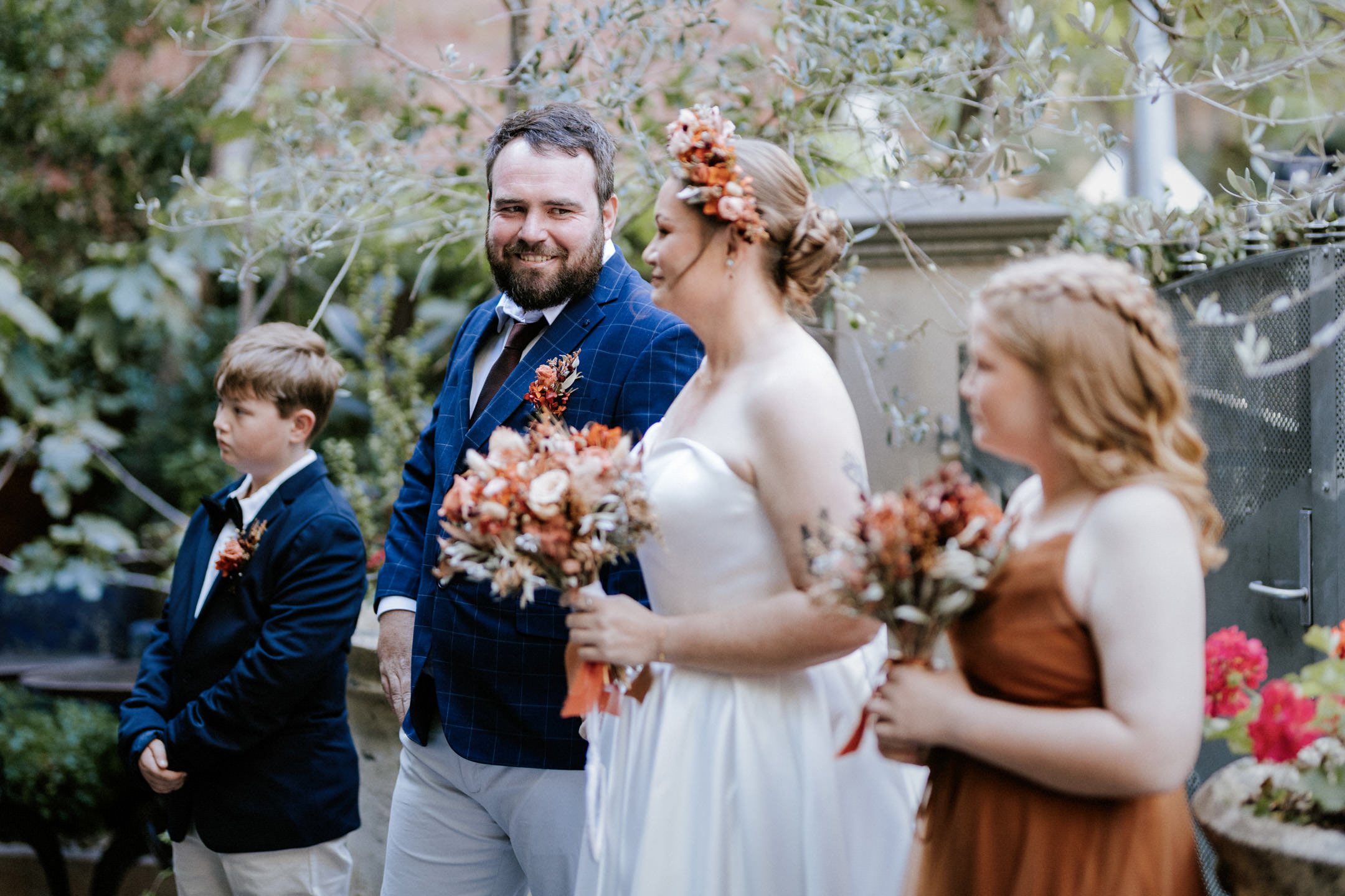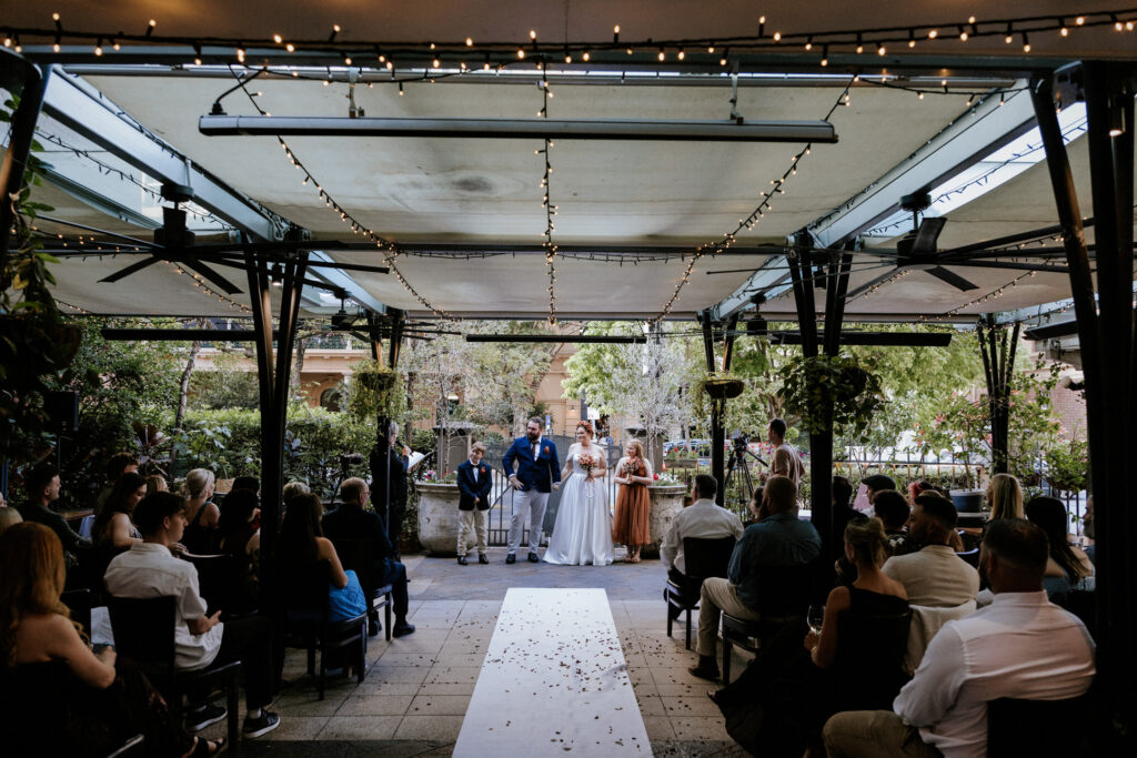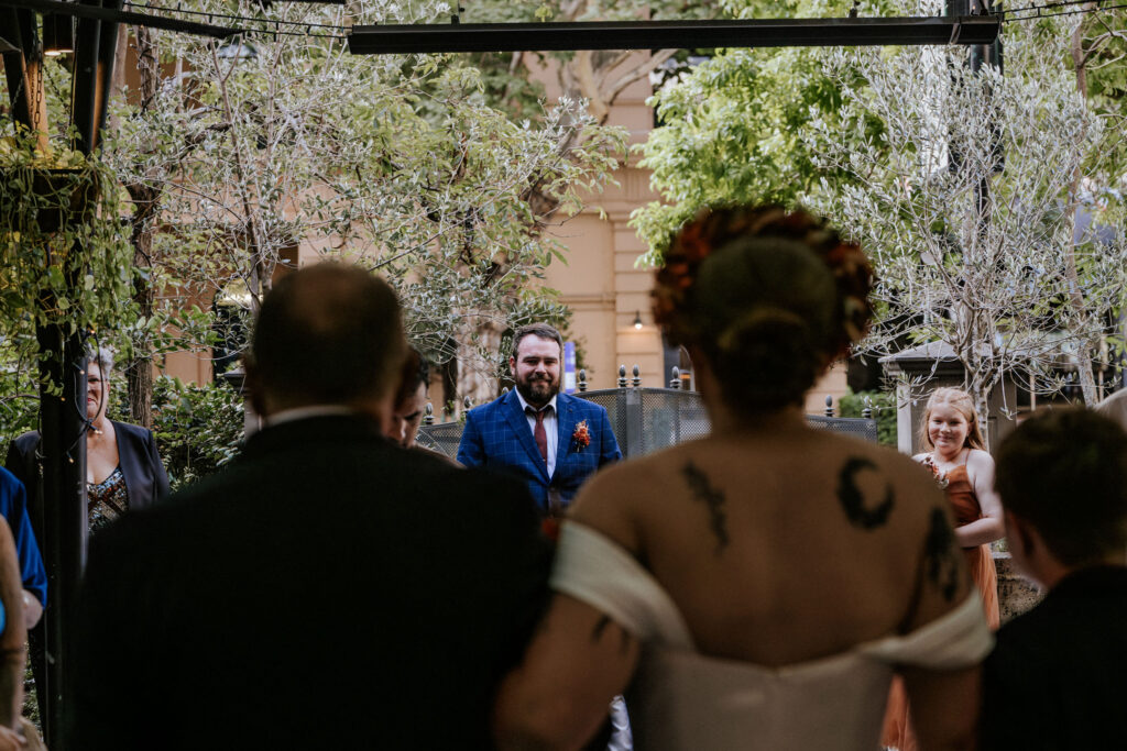Guests gathered and the energy started to build as Maddy arrived in a kombi with her bridesmaid and dad. Then things kicked off with one of the more memorable entrances, the flower men led the way, armed with bum bags full of petals, throwing them out over the crowd and getting everyone laughing straight away. Not long after, Maddy made her entrance, walking down the aisle with her son and dad by her side. All eyes were on her, especially Keith’s.