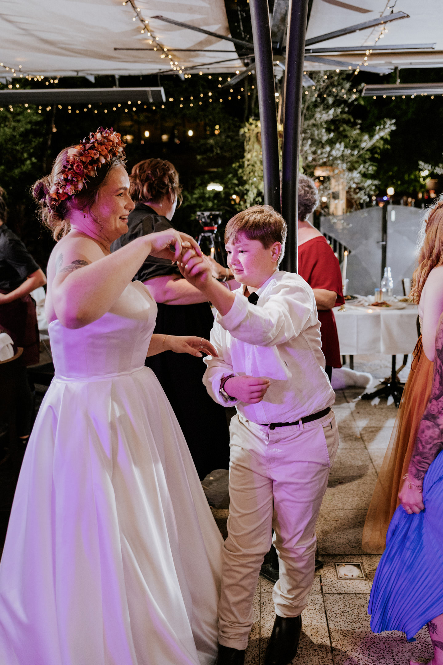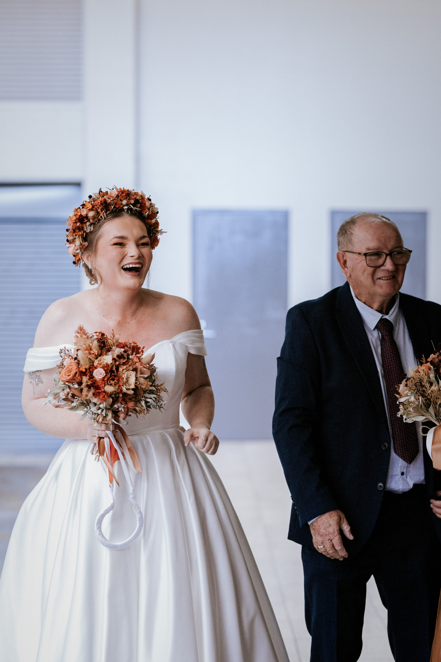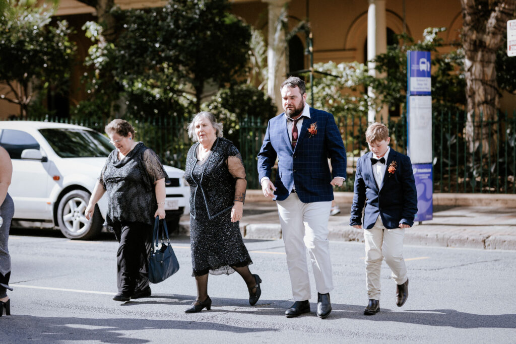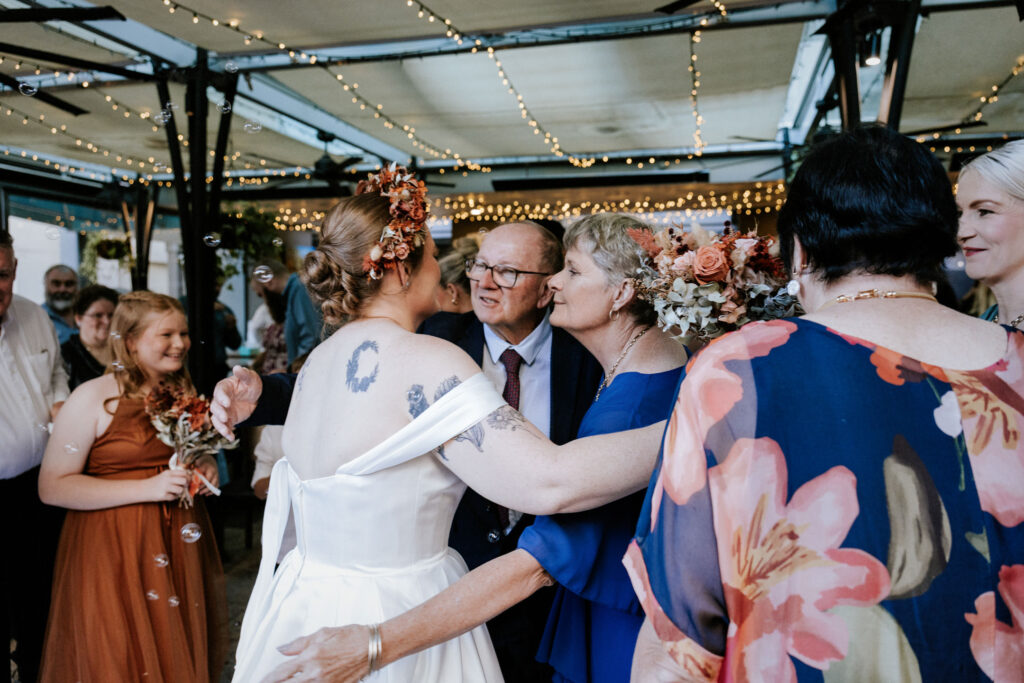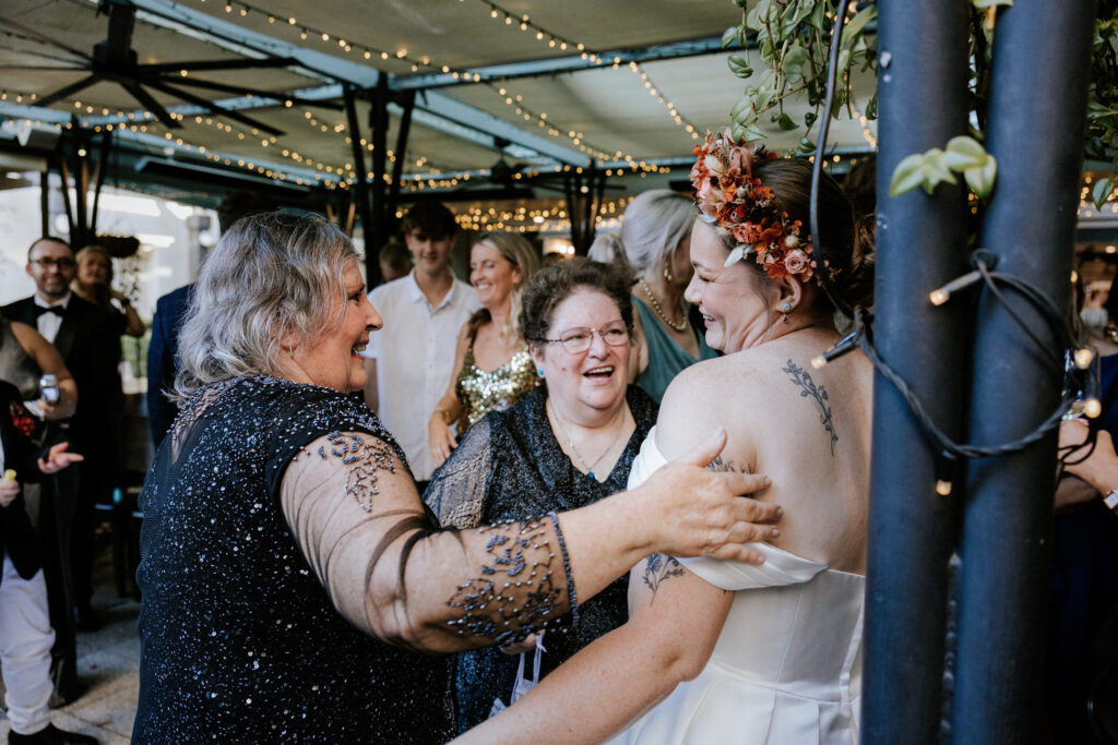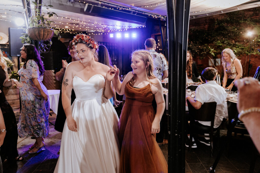 Guests gathered and the energy started to build as Maddy arrived in a kombi with her bridesmaid and dad. Then things kicked off with one of the more memorable entrances, the flower men led the way, armed with bum bags full of petals, throwing them out over the crowd and getting everyone laughing straight away. Not long after, Maddy made her entrance, walking down the aisle with her son and dad by her side. All eyes were on her, especially Keith’s.