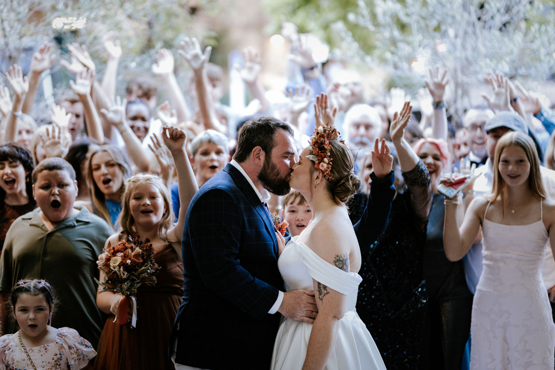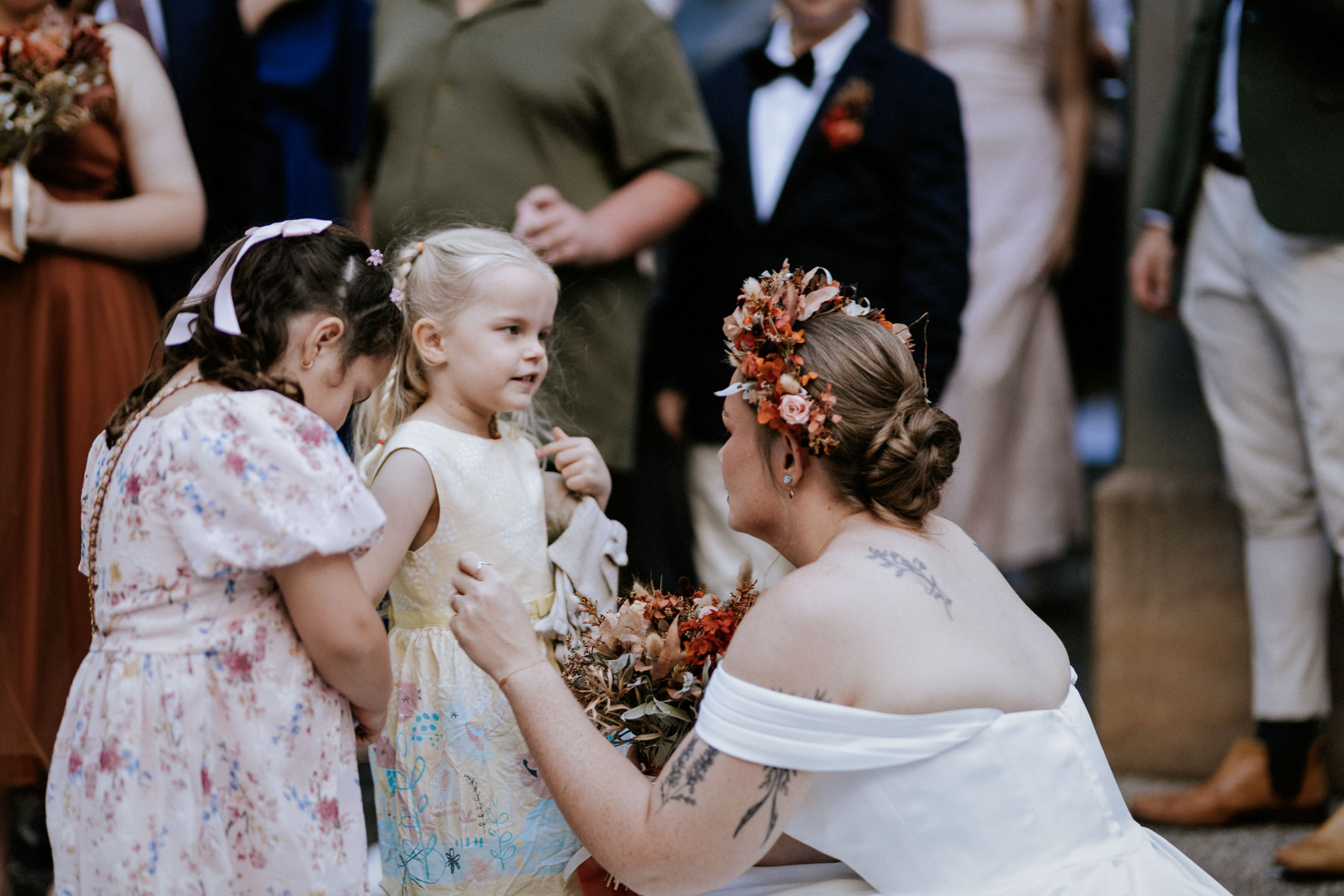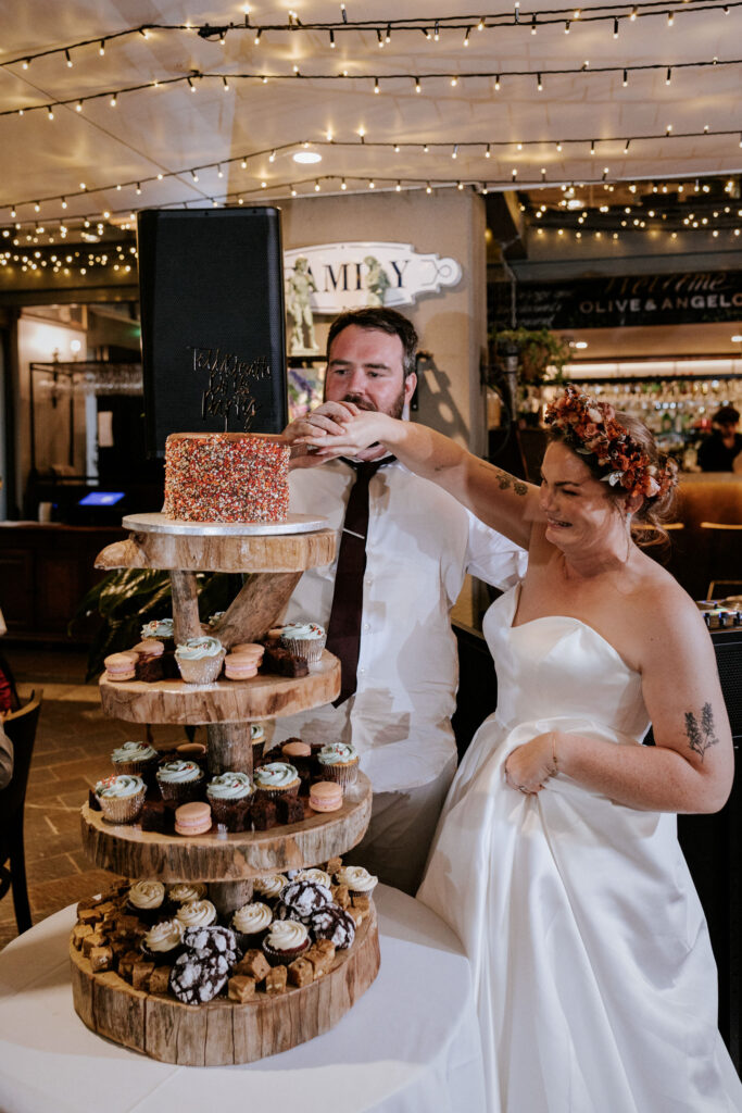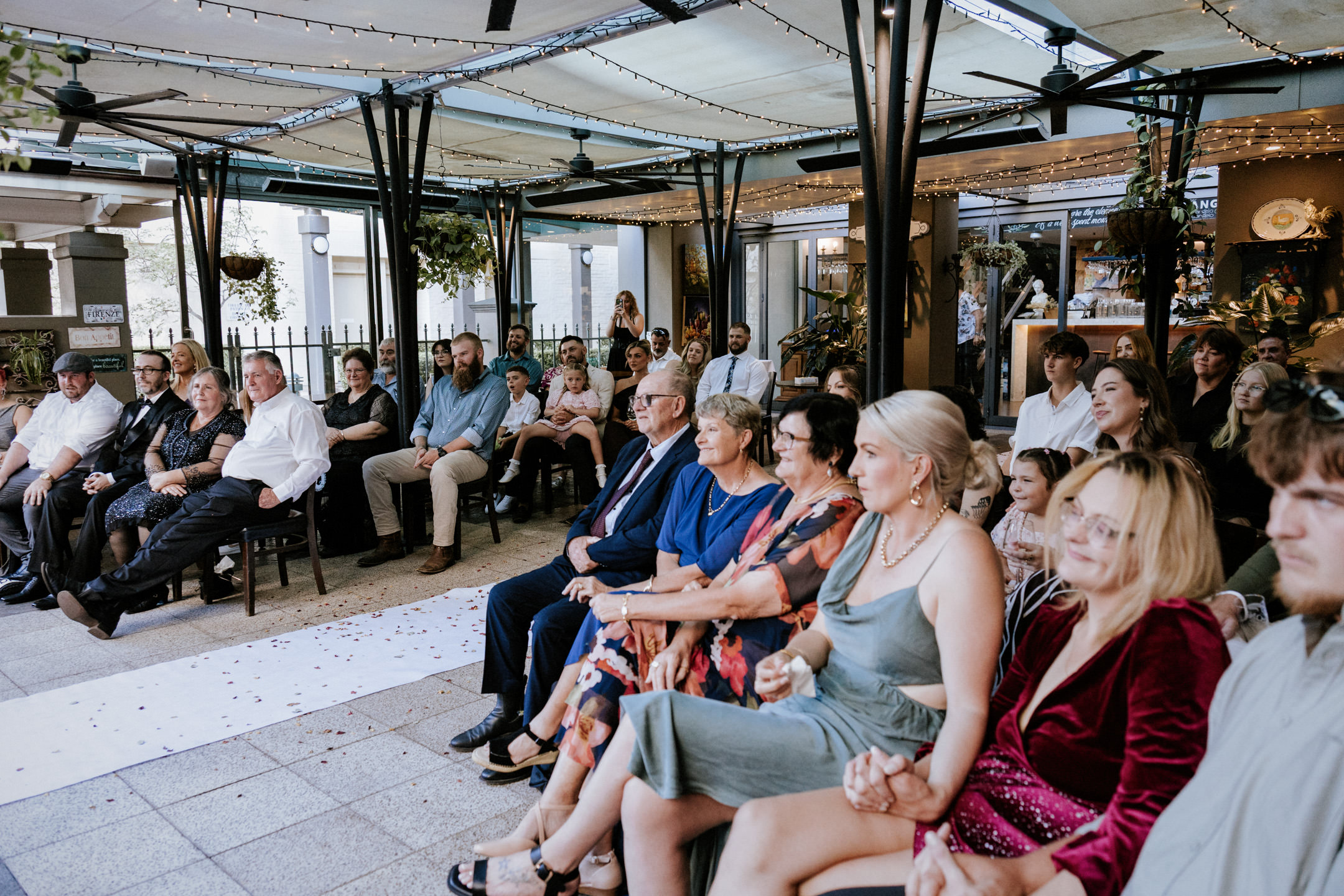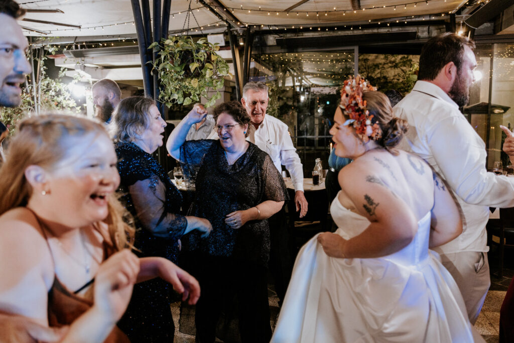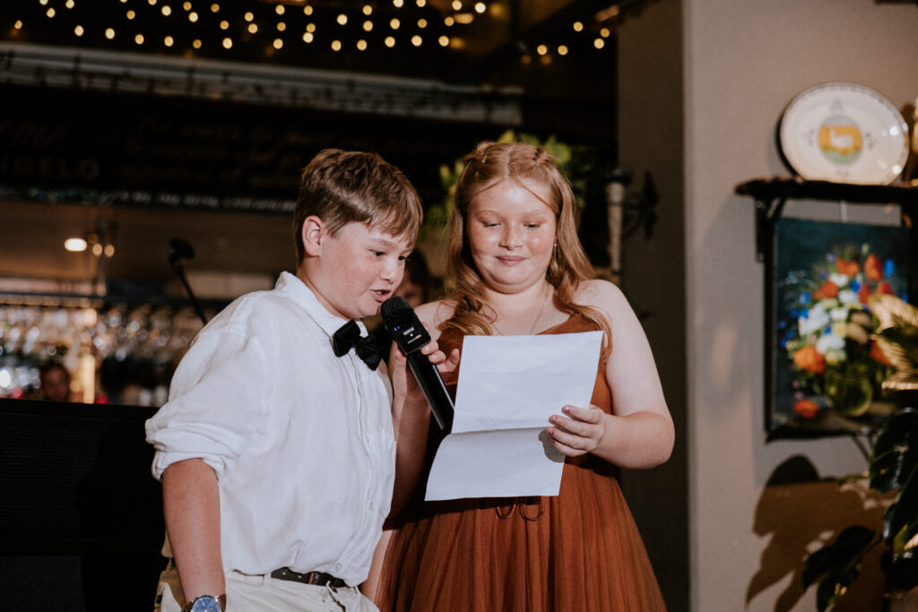 Guests gathered and the energy started to build as Maddy arrived in a kombi with her bridesmaid and dad. Then things kicked off with one of the more memorable entrances, the flower men led the way, armed with bum bags full of petals, throwing them out over the crowd and getting everyone laughing straight away. Not long after, Maddy made her entrance, walking down the aisle with her son and dad by her side. All eyes were on her, especially Keith’s.