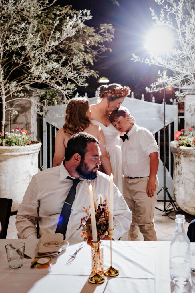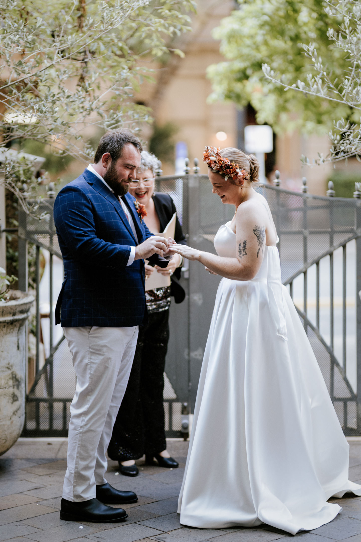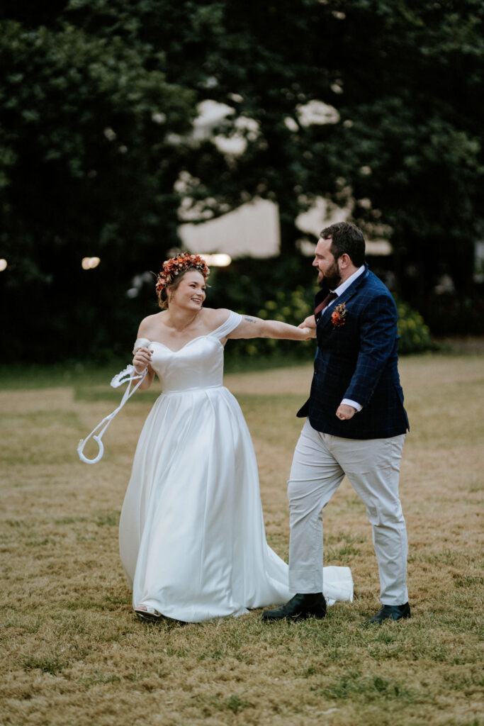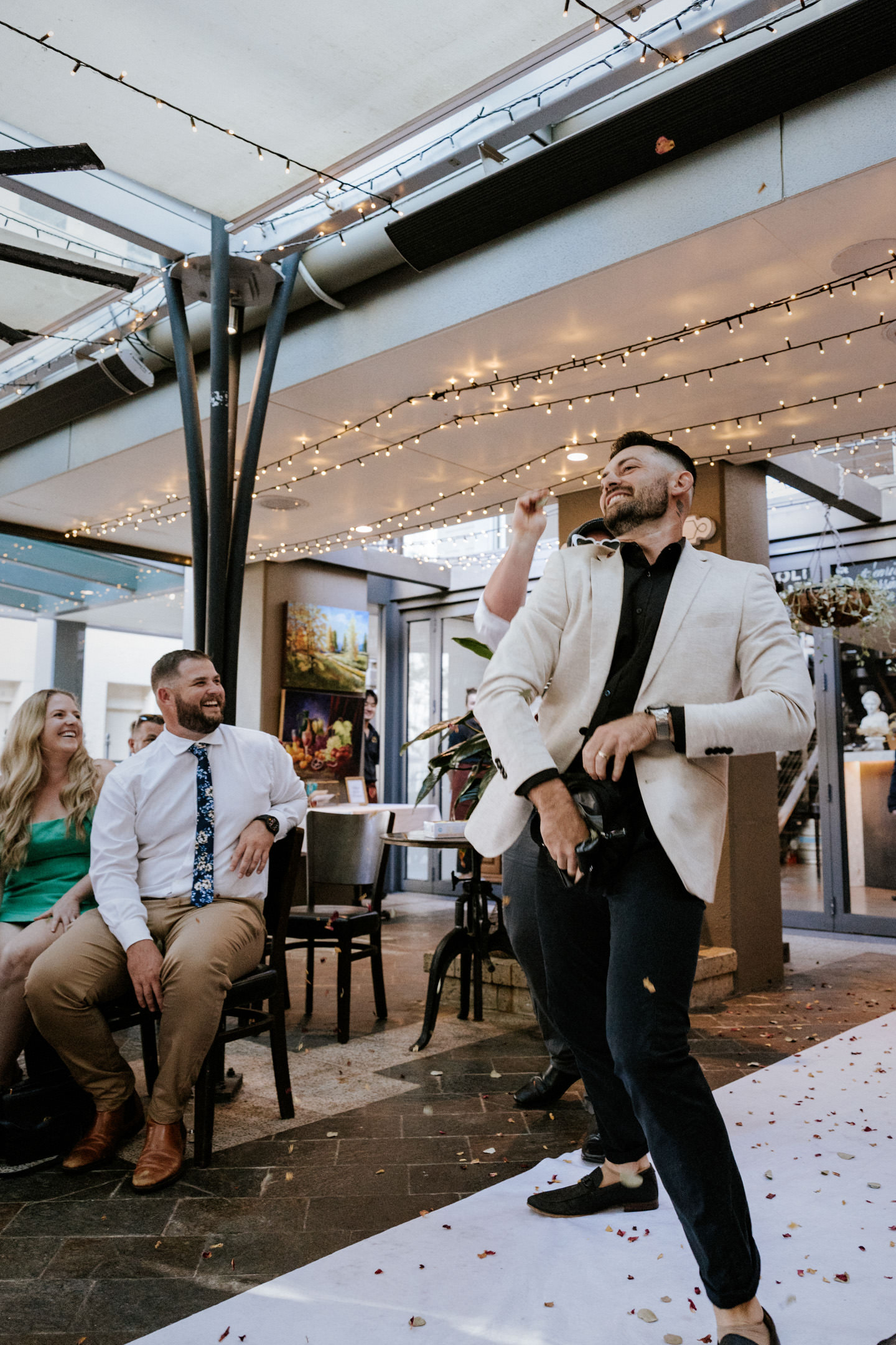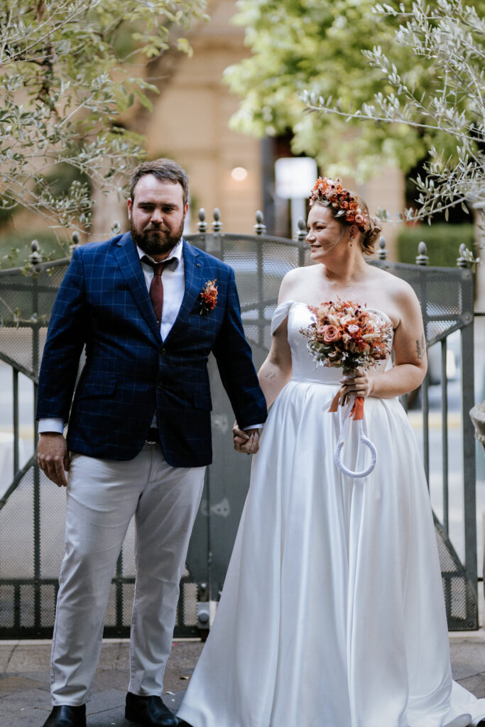 Guests gathered and the energy started to build as Maddy arrived in a kombi with her bridesmaid and dad. Then things kicked off with one of the more memorable entrances, the flower men led the way, armed with bum bags full of petals, throwing them out over the crowd and getting everyone laughing straight away. Not long after, Maddy made her entrance, walking down the aisle with her son and dad by her side. All eyes were on her, especially Keith’s.
