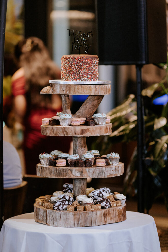 Then came the cake, or more accurately, a dessert spread of fudge, cupcakes, and macarons. Something a little different and very them.